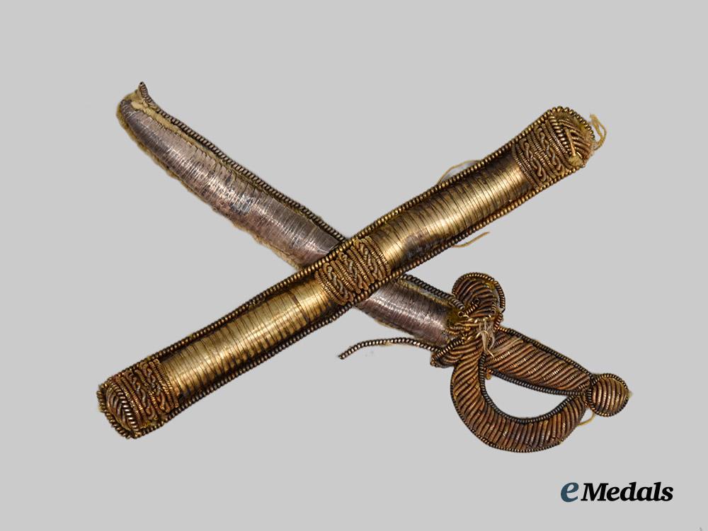 The blade of the sword wrapped in wide bands of silvered wire, the edges of the sword trimmed in fine silvered wire, the shaft of the baton wrapped in wide bands of gilt wire, the sword's handle, along with three areas and the edges of the baton trimmed in fine gold-coloured bullion wire, the reverse in strands of yellowed white threading, measuring 98 mm (w) x 63 mm (h), minor fraying evident in the silvered wire trim on the edge of the sword's blade, near extremely fine.