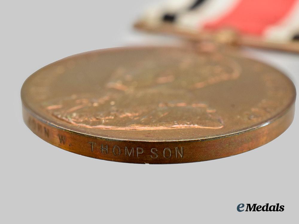 2. A Special Constabulary Long Service Medal. Instituted August 30th, 1919. A circular bronze medal, the obverse bearing the effigy of King George V facing left and circumscribed by his name and title, the reverse with a partial laurel wreath and inscribed with “For Faithful Service in the Special Constabulary” in capitalized lettering, suspended from a single-toe horizontal medal bar from a period original ribbon, the edge inscribed “John W. Thomson”, measuring 36.2 mm in diameter.