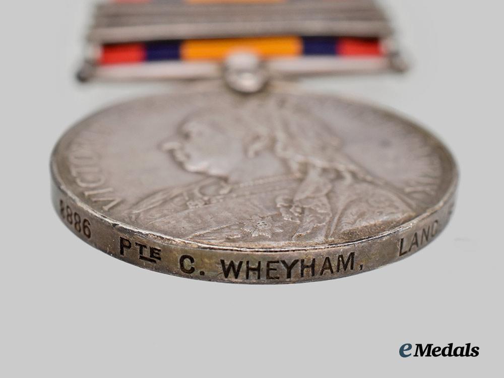 1. A Queen’s South Africa Medal with Transvaal, Orange Free State, and Cape Colony Clasps. Instituted in 1900. A round circular silver (tested) medal, the obverse depicting a crowned and veiled effigy of Queen Victoria facing left and circumscribed by her name and title, the reverse depicting Britannia holding the Union Flag in her left and and a laurel wreath in her right hand, the right background are troops marching inland from the coast while the left background consists of two men-of-war, circumscribed “South Africa”, in capitalized lettering, suspended from a single toe claw mount and a pin through the upper edge of the medal, featuring three clasps including “Transvaal, Orange Free State, and Cape Colony”, the edge inscribed “8886 PTE. C. WHEYHAM. LANC. FUS.”, measuring 36.3 mm in diameter.