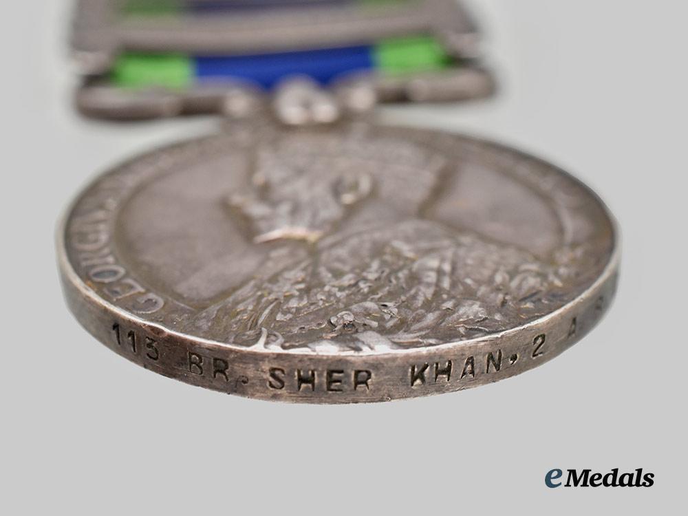 2. An Indian General Service Medal (1909) with Waziristan 1919-21 and Mahsud 1919-20 Clasps. Instituted January 1st, 1909. A round circular silver (tested) medal, the obverse depicting a crowned King George V facing left and circumscribed by his name and title, the reverse depicting the Jamrud Fort at the Khyber Pass with the word “India” below between a wreath of oak and olive branches, suspended from a double toa claw mount, featuring two clasps including “Waziristan 1919-21” and “Mahsud 1919-20”, the edge inscribed “113 RR. Sher Khan, 2. A.B.C”, measuring 36.3 mm in diameter, with evidence of previous collector mounting on the correct modern replacement ribbon.