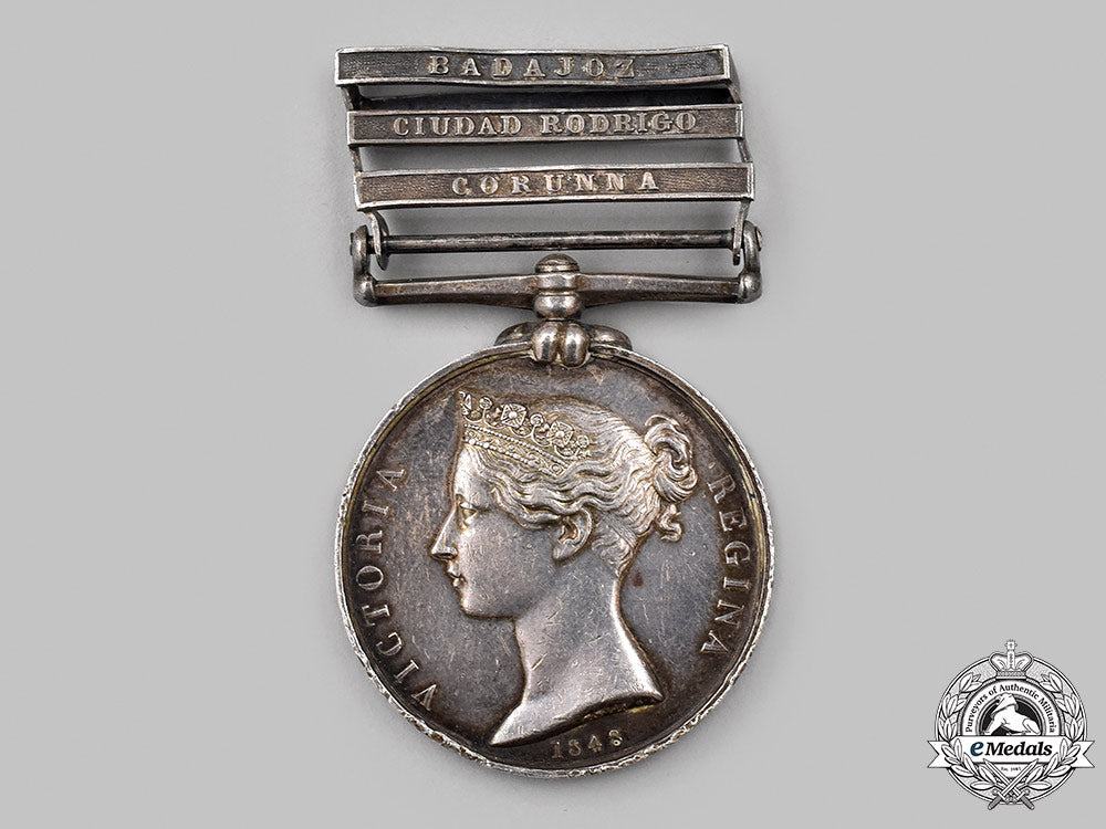 Instituted 1847. In silver, a military general service medal, with unofficial contemporary engraved naming THOMAS BLOOMFIELD 35TH RIFLE REGT, with BADAJOZ, CIUDAD RODRIGO and CORUNNA clasps, worn on a replacement ribbon, heavy edge bruising, in near very fine condition.