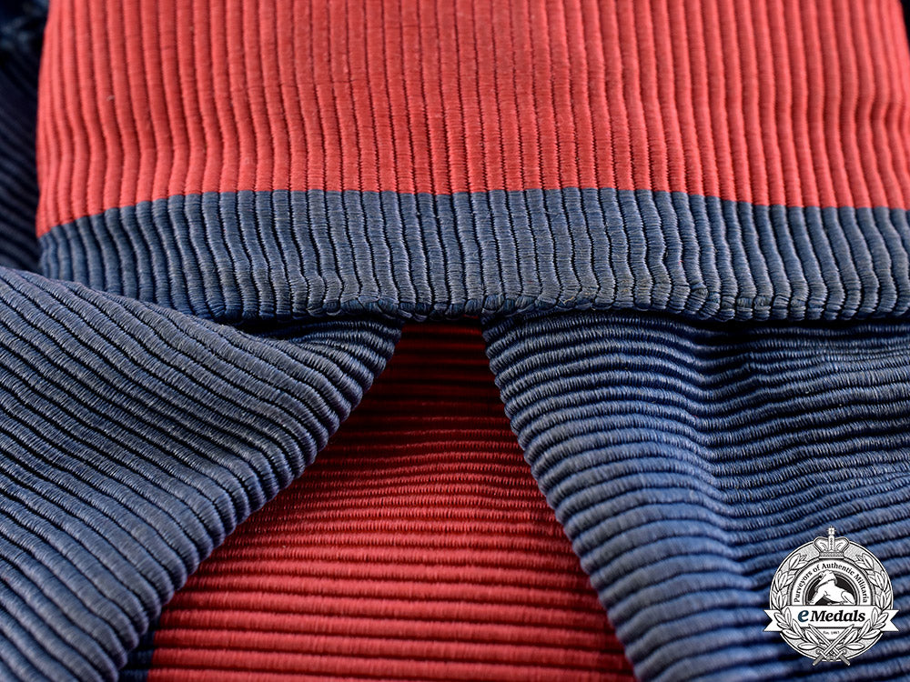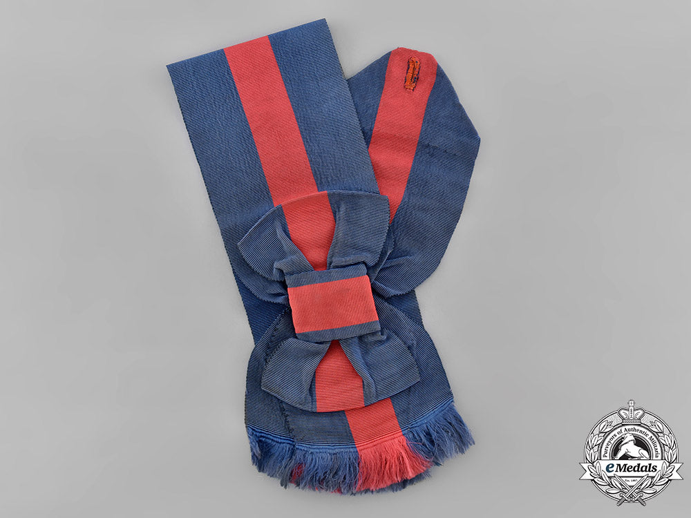 Fabricated from silk, incorporating a decorative moiré pattern, with a central red stripe flanked by wide navy blue stripes on either side, a large bow-tie rosette at the bottom end, two reinforced button holes at the top end, a second shorter piece sewn in place on the reverse behind the rosette, the shorter piece with a single reinforced button hole at the opposite end, measuring 100 mm wide x 580 mm in length, exhibiting soiling overall, without interruption in the fabrics, very fine.