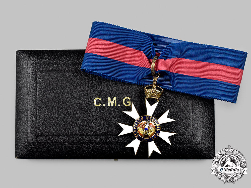 Footnote: The Most Distinguished Order of Saint Michael and Saint George was established by the Prince Regent in the name of King George III in 1818. It was created to recognize subjects of Malta and the Ionian Islands, which had come under the control of the United Kingdom following the end of the Napoleonic Wars. After the Ionian Islands were ceded to the United Kingdom in 1864, the Order was extended to the rest of the British Empire in 1868. Men wear the Companion on a neck ribbon. Companions are entitled to use the post-nominal letters CMG.