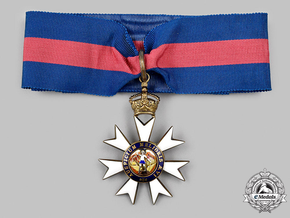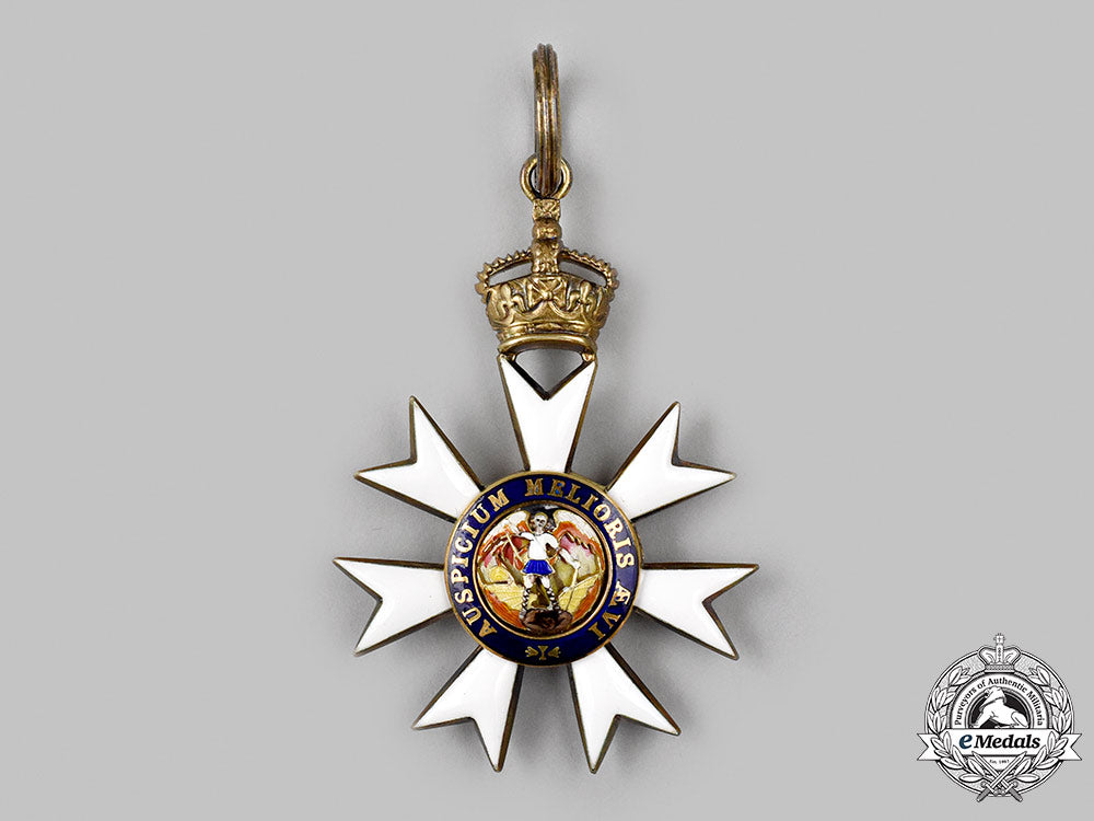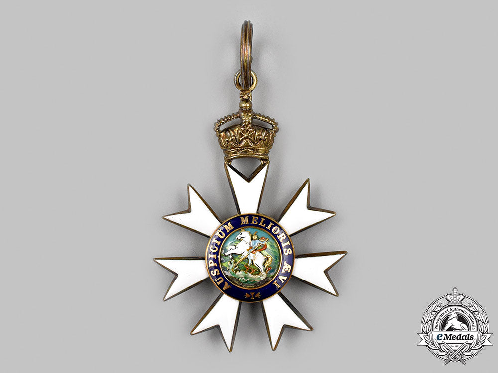 Instituted April 28, 1818 by Prince Regent in the name of King George III. A beautiful Companion of the Order of St. Michael & St. George, presenting a silver gilt Maltese Asterick with white enamels with crown suspension, the obverse center in Gold presenting an enamelled motif of a winged St. Michael slaying Satan with a blue enamelled surround inscribed AUSPICIUM MELIORIS ÆVI (Token of a Better Age), the reverse Gold medallion presents a richly enamelled motif of St. George riding a white horse slaying a green dragon with a blue enamelled surround inscribed AUSPICIUM MELIORIS ÆVI (Token of a Better Age), measures 47.30mm (w) x 69mm (h – inclusive of crown suspension and surmounting integral ring), weighs 51.9 grams (inclusive of neck ribbon), unmarked, worn on a period neck ribbon with simple hook and eye clasp at ends, small enamel wear to obverse and reverse medallions however enamel arms intact, in near extremely fine condition.