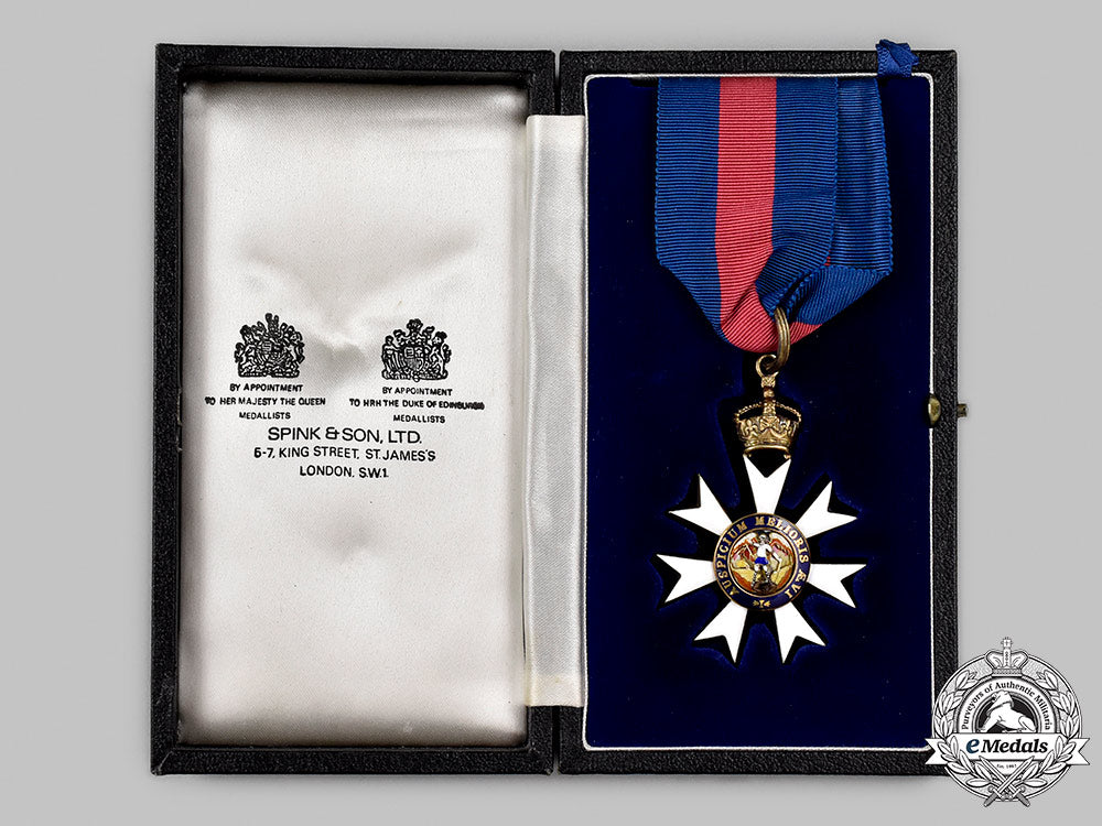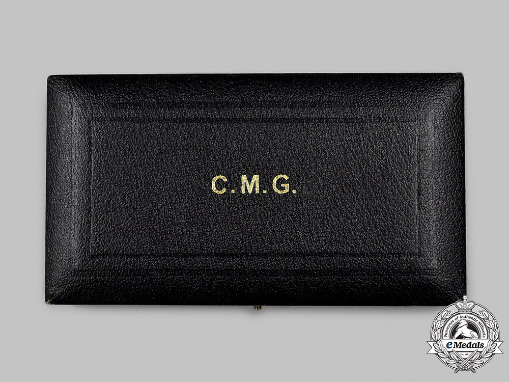 Contained in a hardshell case of issue, marked C.M.G on the exterior lid, the interior lid is maker marked SPINK & SON LTD., the decoration sits in a raised removable platform with a recessed blue velvet medal bed, hinge and clasp fully functional, very minor exterior wear, in extremely fine condition.