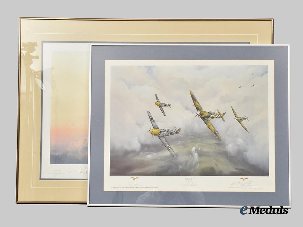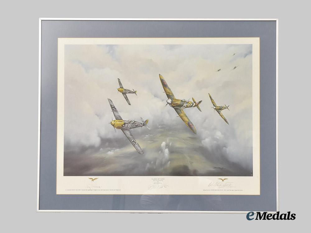 1. "Clash of Aces", from an oil painting by Jeff Pritchard, signed by Adolf Galland and R.R.Stanford-Tuck, measuring 68 cm (w) x 55 cm (h) in frame;