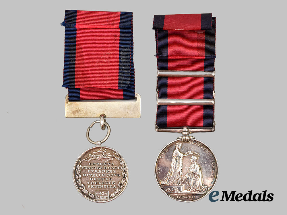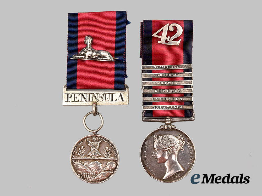 Military General Service Medal, impressed “D. Grant, Serjt 42nd foot”, six clasps; Toulouse, Orthes, Nive, Nivelle, Pyrenees, Salamanca, and a silver “42” regimental attachment, accompanied by a fine Regimental medal with a silver Peninsula Suspension and a sphynx clasp, engraved to “D. Grant” on rim, measuring at 32 mm in diameter, fine.