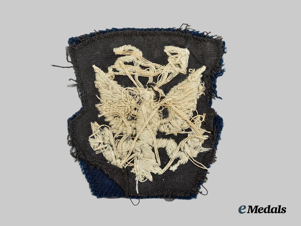 A rare Royal Air Force (RAF) Eagle Squadron shoulder patch, constructed of white machine embroidery in the shape of an eagle with open wings clutching a stem of laurels and a grouping of five lightning bolts, surmounted by “E.S.” embroidered at the top, on a dark blue wool core and a black cotton backer, measuring 70 mm (w) x 78 mm (l).