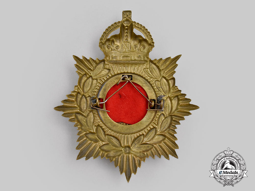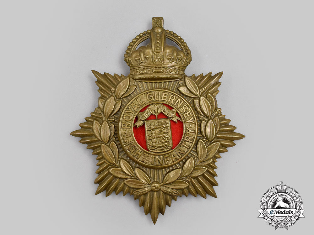 Two-piece construction, in die-stamped bronze gilt, unmarked, centrepiece bearing the coat-of-arms of the Channel Island of Guernsey, surrounded by the inscription "ROYAL GUERNSEY / LIGHT INFANTRY", with a piece of red felt placed behind the voided area in the centrepiece, mounted to a base with seven star points incorporating multiple emanating rays, surmounted by a King's crown, the centrepiece framed within an open-ended wreath of laurel leaves, measuring 108.5 mm (w) x 128.8 mm (h), the two lugs on the plate and the three lugs on the centrepiece wired together and are intact, extremely fine.