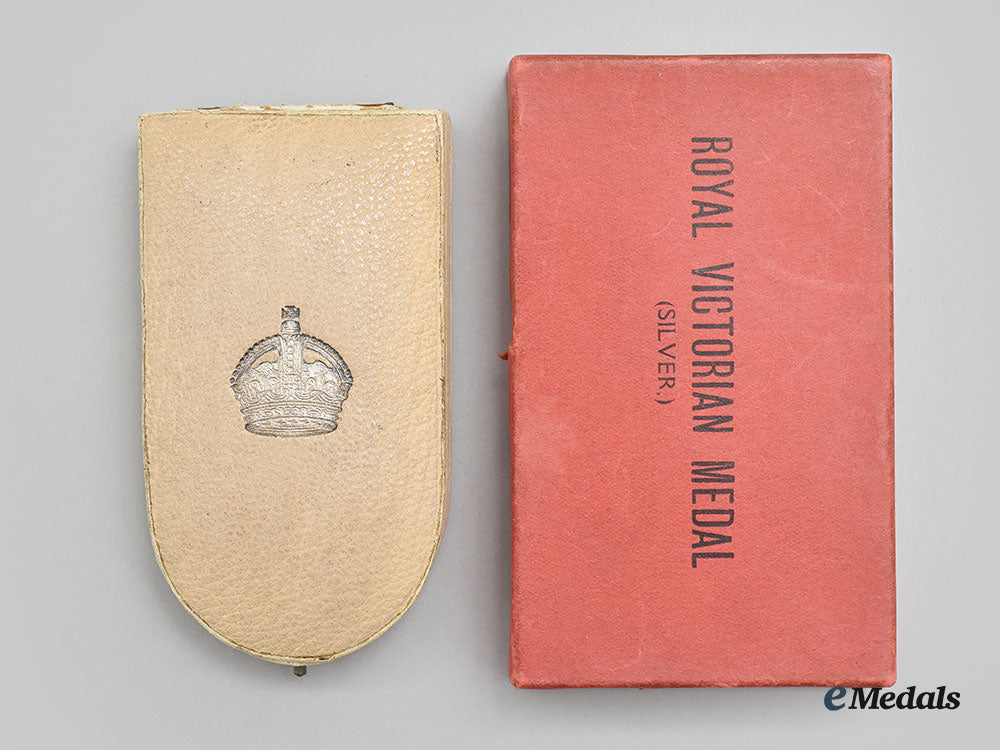 The case is fit into a red cardboard box, exterior states “ROYAL VICTORIAN MEDAL (SILVER,)” small rip at edge, minor fading, in very fine condition.