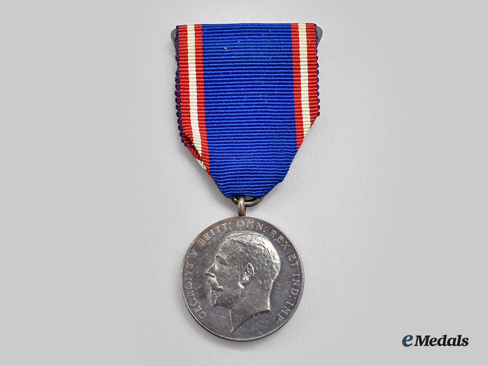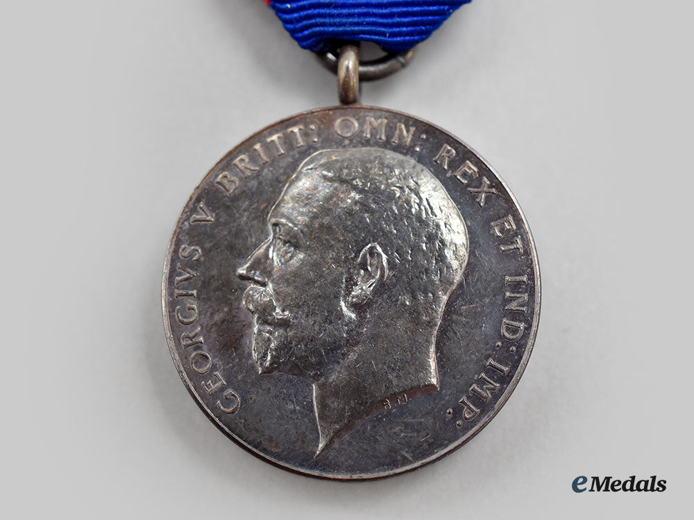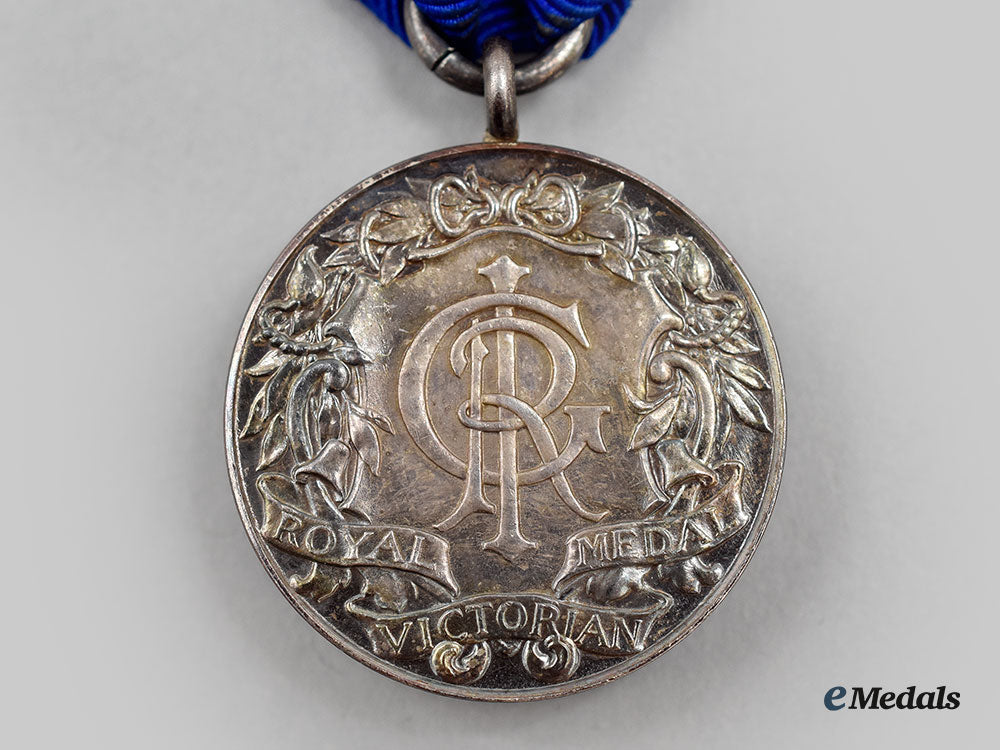 Instituted April 21 1896. George V. In silver, a round medal featuring the left facing profile of George V, the reverse with the cypher of George V on a shield, surrounded by a wreath with banner at 6 o’clock inscribed ROYAL VICTORIAN MEDAL, measures 28.5mm in diameter, worn on original ribbon with horizontal brooch style pin on reverse, dark patina, light wear, remains in extremely fine condition.