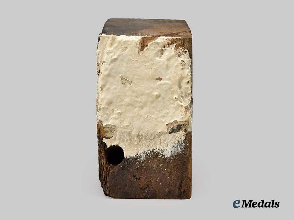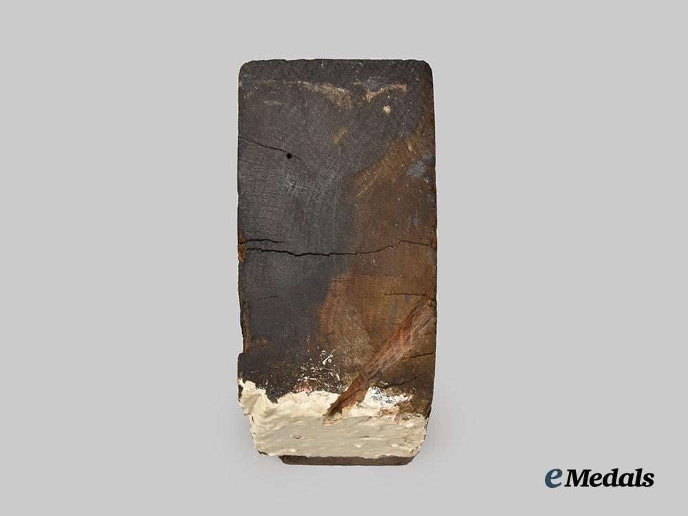 A block of oak, one side consisting of a section of white paint,also single drill hole, one side is a fresh cut, single side with worming, measuring 14 cm x 14cm x 8 cm, 1.3 kgs; accompanied by Certificate of Provenance - Save the Victory Fund (1938)