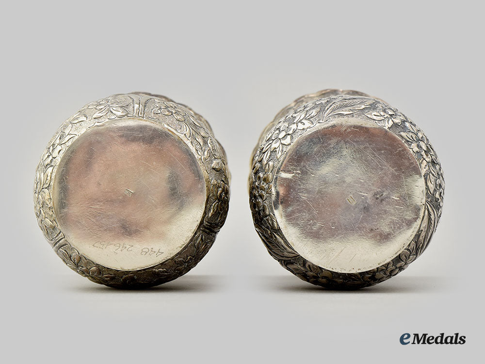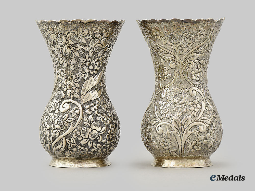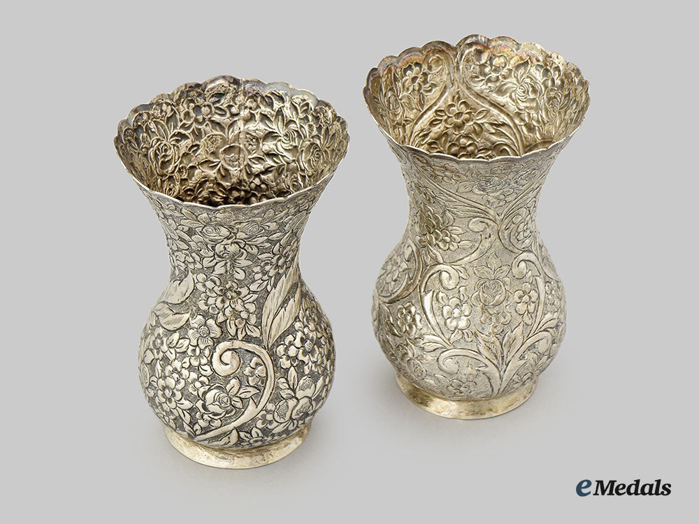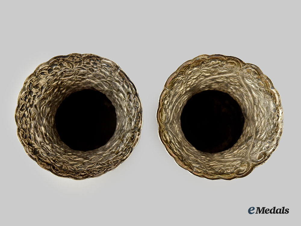 United Kingdom. A Set Of Two Floral Patterned Silver Flower Vases