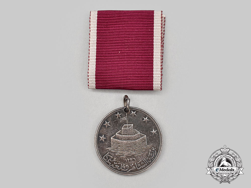 (Akka Madalyasi). Instituted in 1840. In silver, obverse illustrating a fortress flying the Ottoman flag, with six five-pointed stars above, a commemorative inscription along with the Arabic date "1256" according to the Muslim calendar below the fort, reverse illustrating the tughra representing Sultan Abdulmejid (1839-1861) within an open-ended wreath of laurel leaves, measuring 29.7 mm in diameter, ring suspension, dark patina, bruised, edge nicks, accompanied by a replacement ribbon, better than very fine.