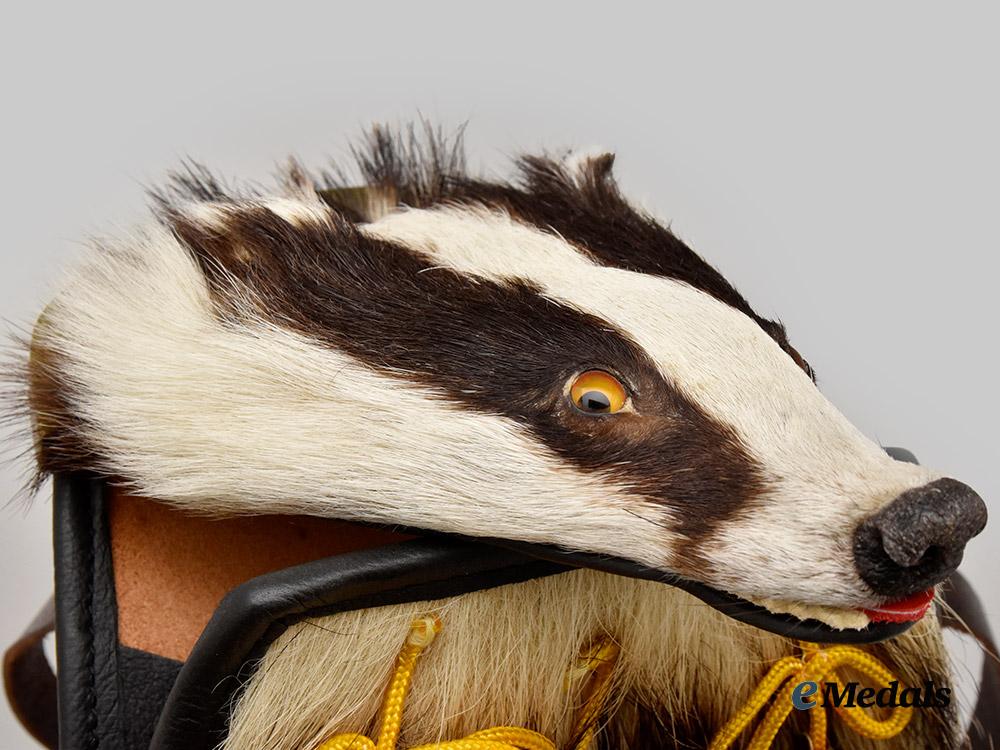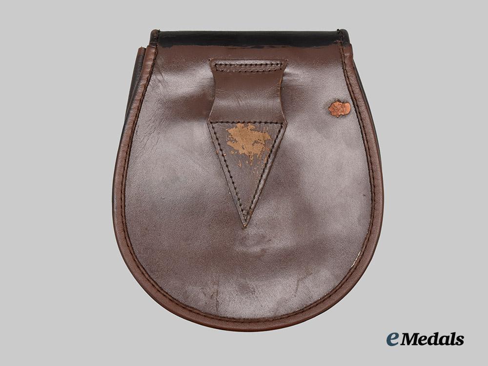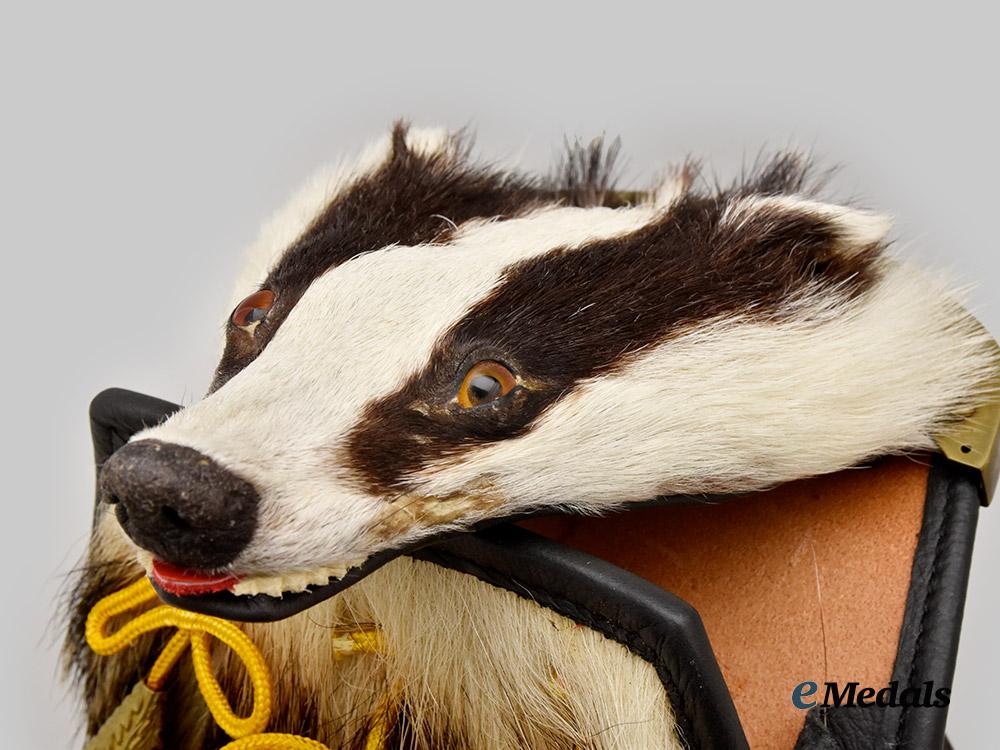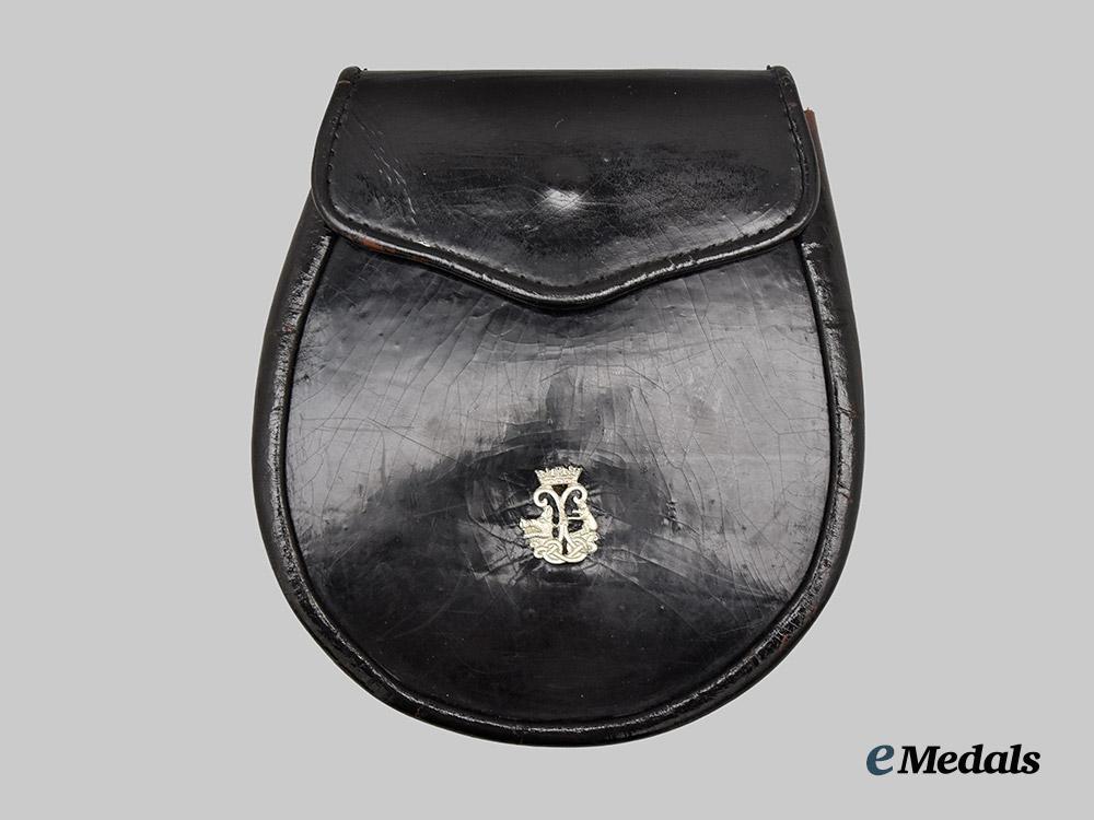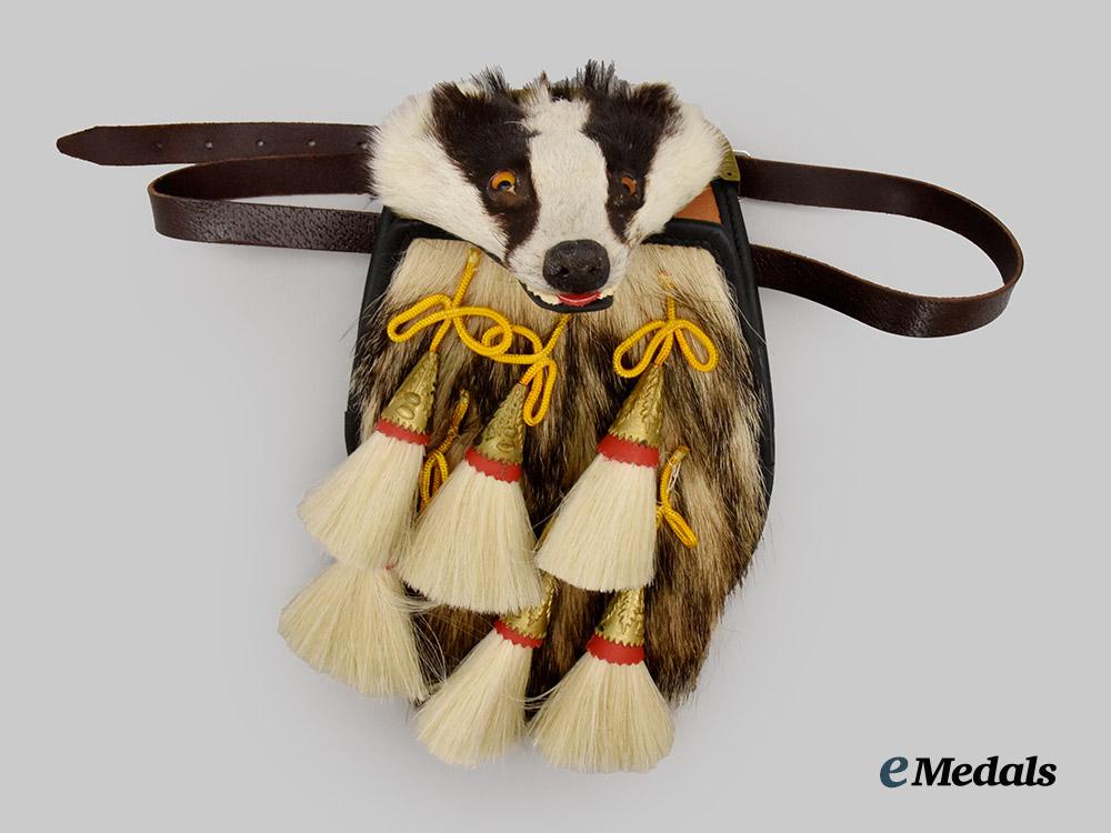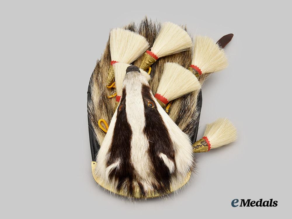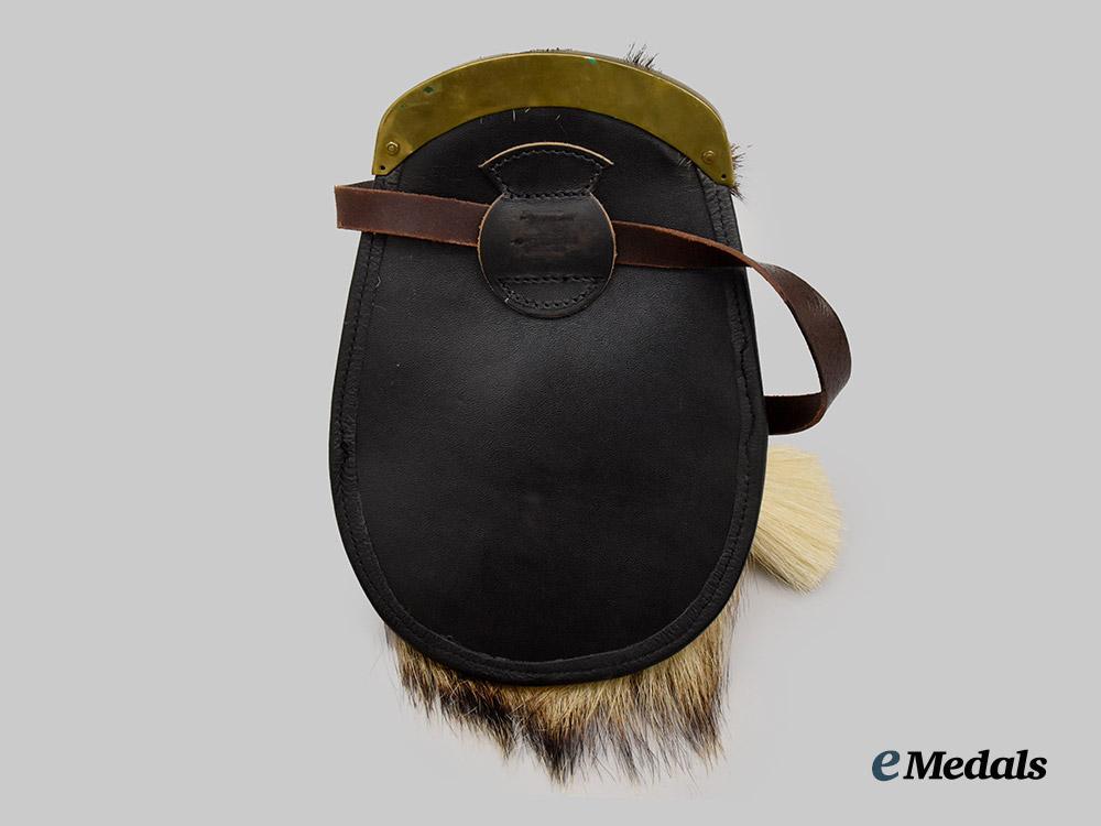 Also accompanied by regimental Sporran with a nicely finished pebbled black upper, raw underside, the front bearing insignia in white metal which is affixed to the sporran via one lug that passes through the body of the sporran and is secured in place via a large pin on the inside, belt loop on reverse; finally, accompanied by traditional Scottish Badger sporran, featuring the brass guard at top, with badger head and 6 tassels with gilt brass fittings, reverse plain with belt loop and brown leather belt, 12.5 inches in length, extremely fine and only light wear.