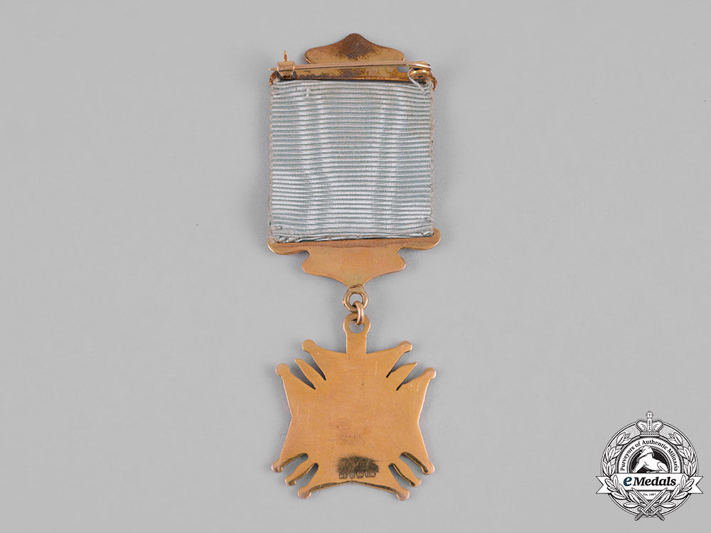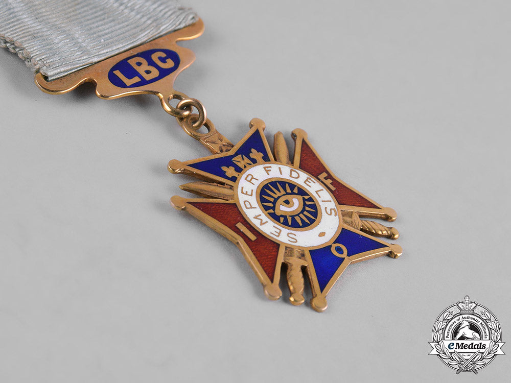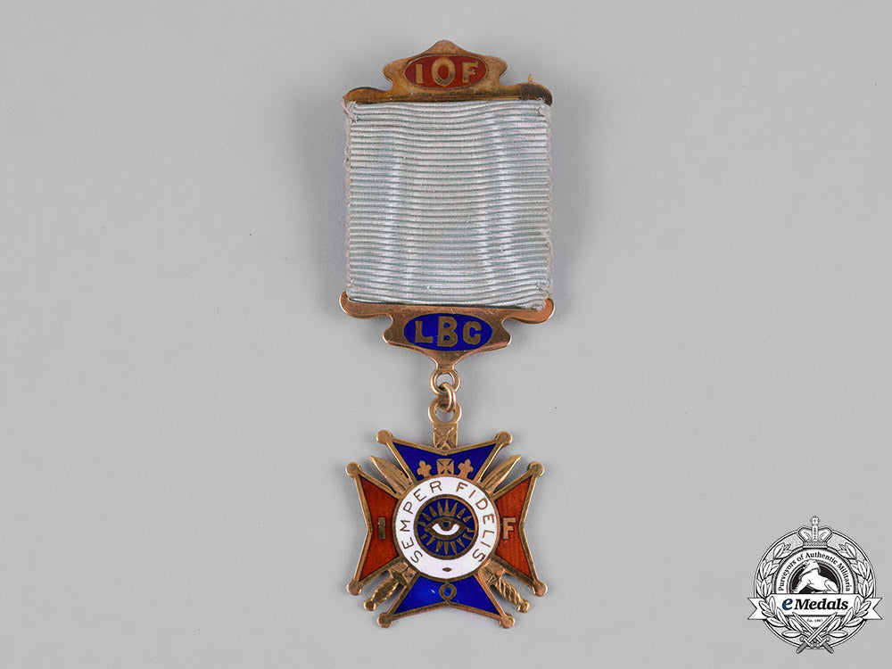 In 10K Gold with red, white and blue enamels, weighing 7 grams inclusive of its ribbon, marked with the British lion, date marked "K" (1934), marked with an anchor (made in Birmingham) and marked "10K" (Gold) on the reverse, measuring 24.3 mm (w) x 28.5 mm (h), suspension bar inscribed "LBC", original ribbon suspended from a hanger with pinback inscribed "IOF", intact enamels, light contact, near extremely fine.
