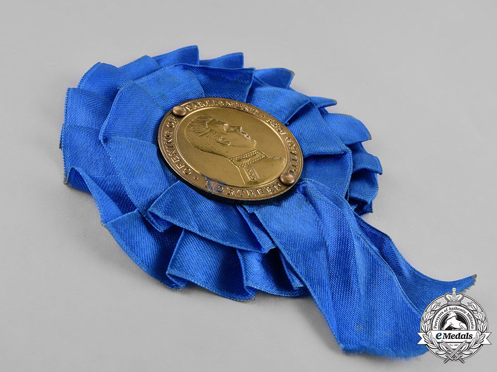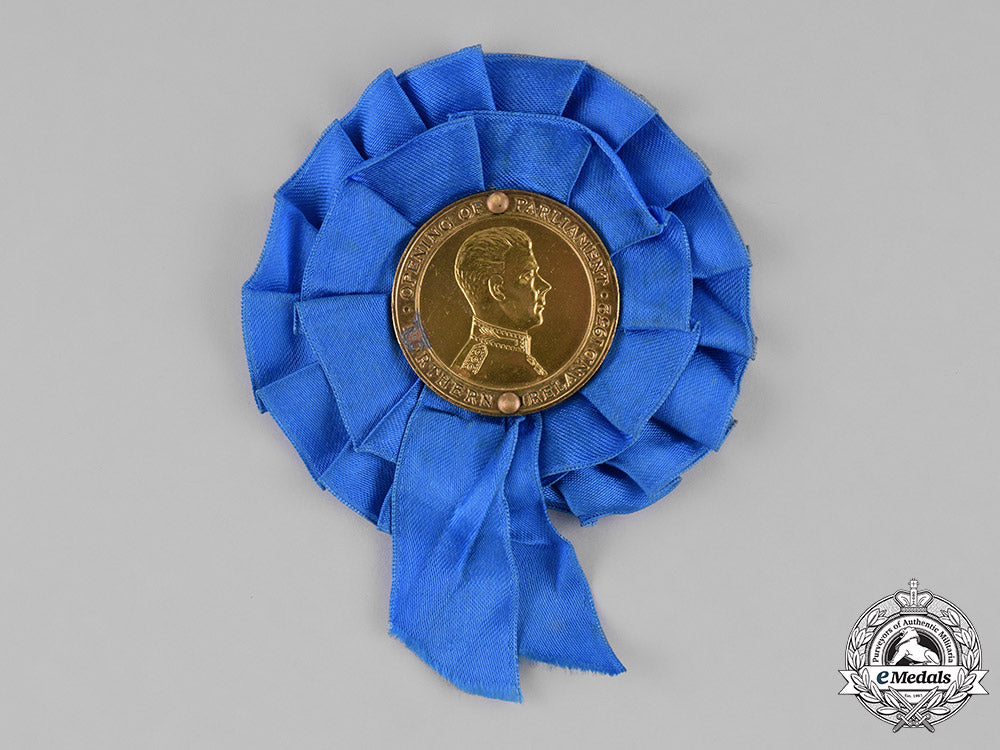 In brass, illustrating the right-facing bust of Edward, Prince of Wales (the future King Edward VIII). surrounded by the inscription "OPENING OF PARLIAMENT / NORTHERN IRELAND 1932", measuring 41.3 mm in diameter, exhibiting an oxidation spot over the letters "NO" of "NORTHERN" on the obverse, light contact, mounted in the centre of a blue ribbon rosette, the rosette with white mesh backer and safety pin attachment, better than very fine.