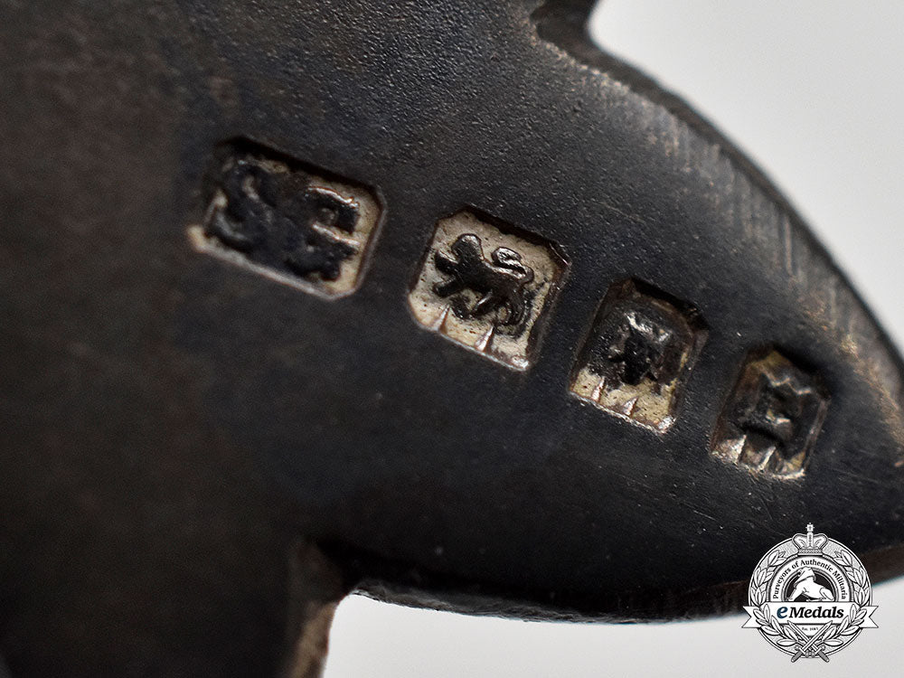 Instituted June 4 1917. Civil Division. In silver, a member badge with the obverse inscription FOR GOD AND THE EMPIRE, the reverse is marked SG maker mark denoting Garrard and silver hallmarks including the lion passant, London city mark and ‘c’ date mark denoting 1918 manufacture, with surmounting crown, measures 48.9mm (w) x 63.3mm (h – inclusive of integral crown suspension), weighs 27.2 grams (including ribbon), worn on original purple ribbon denoting civil division with pinback at top, dark patina, minor wear, in near extremely fine condition.