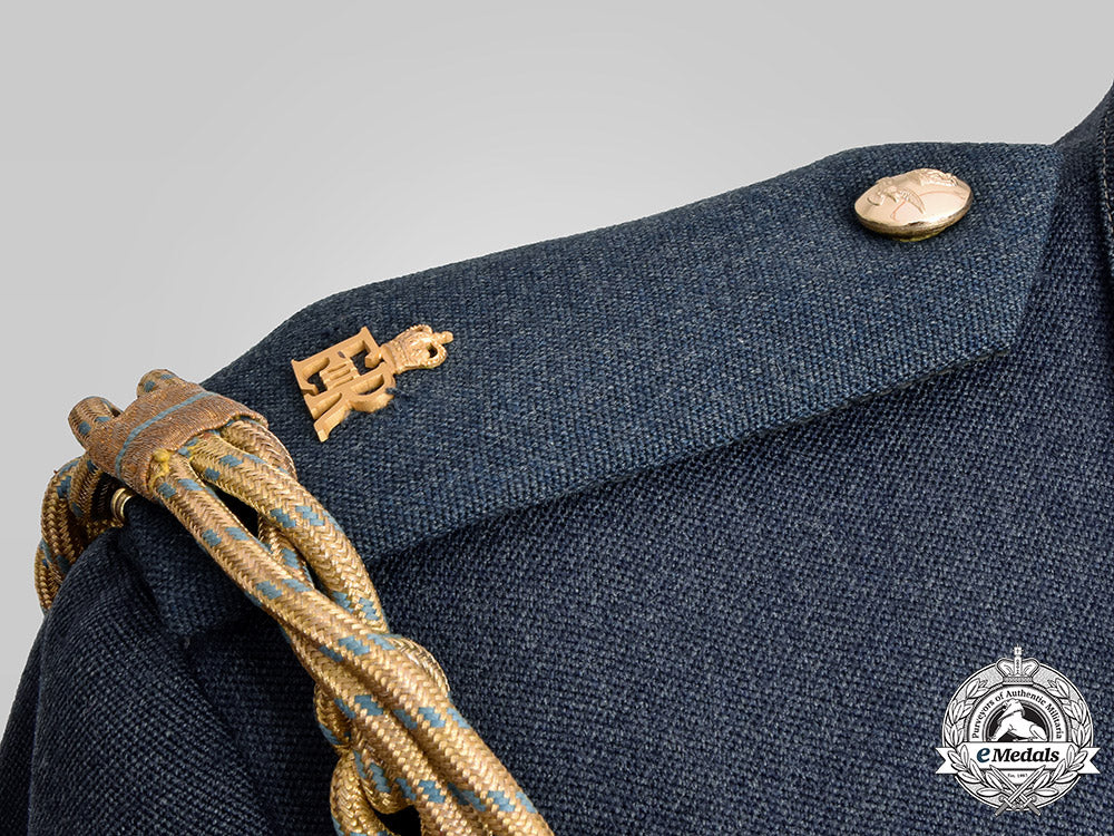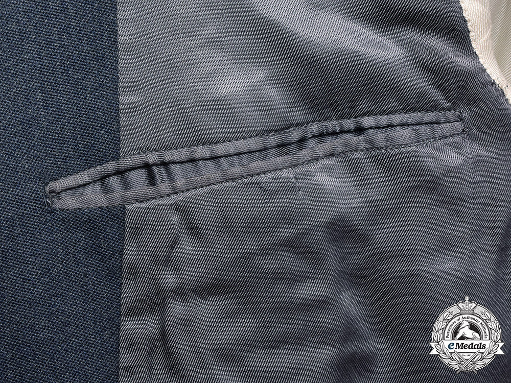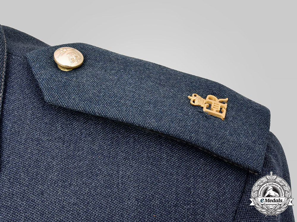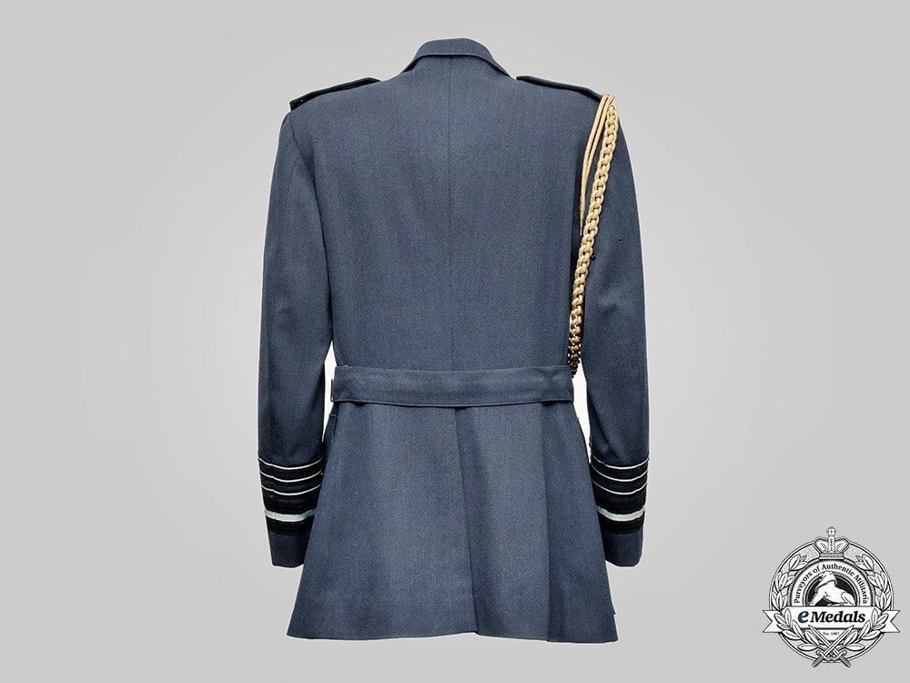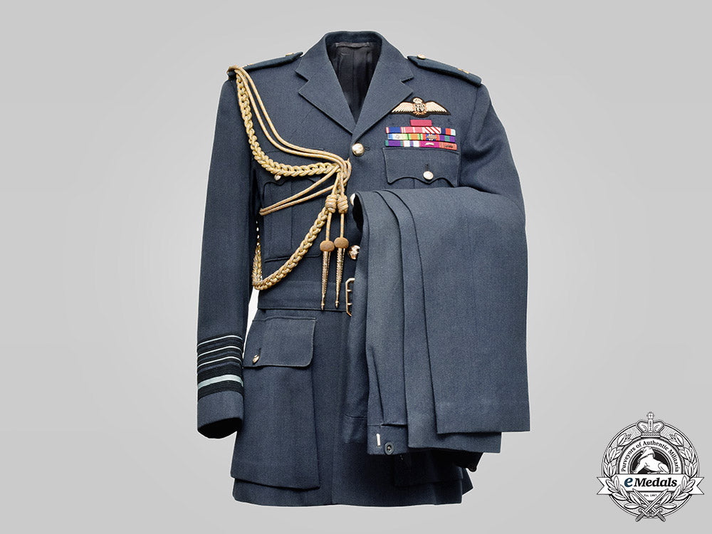 The tunic comes with an aiguillette, the cord fabricated from a fine gold-coloured aluminum wire interlaced with a light blue embroidery, with both ends incorporating gold-coloured metal tips, each of the ball caps on the tips with a mesh cap in fine twisted gold-coloured wire. The inside is lined in a gray rayon, a top-entry pocket on the right breast, with a manufacturer's label sewn in place inside the pocket inscribed "Gieves LIMITED LONDON", with the owner's surname having been blacked out but the initials "T. N." and the service number "85/21938." remaining, along with a large "1" in handwritten blue ink, while the sleeves are lined in a bluish-white rayon. A strap for hanging the tunic from a hook is sewn in place in the collar, the tunic measuring 460 mm across the shoulders x 790 mm in length. The accompanying trousers are also fabricated from the same grayish-blue coloured wool blend as the tunic. They come with a zippered fly and a hook and bar closure above at the waist, ensuring a snug fit. There are a series of six bluish-black plastic buttons spaced in pairs at intervals around the waist. It has two white cotton-lined pockets, one on each side at the front with a traditional hip-side entry, and is partially-vented at the rear. Inside, the waistband is fabricated from a gray rayon, with a white cotton strap sewn in place on the left side with two reinforced buttonholes, plus a bluish-black plastic button at the front. There is a manufacturer's label sewn in place at the rear inscribed "Gieves LIMITED LONDON", with the owner's surname having been blacked out but the initials "T. N." and the service number "85/21938." remaining, along with a large "M" in handwritten blue ink. The manufacturer's label and owner's information matches that of the one that appears in the tunic. The trousers measure 900 mm around the waist x 1,140 mm in length overall, with a hole in the left leg. Both the tunic and trousers with intact stitching and are very clean, other than the staining evident on the white pockets of the trousers. Better than very fine.