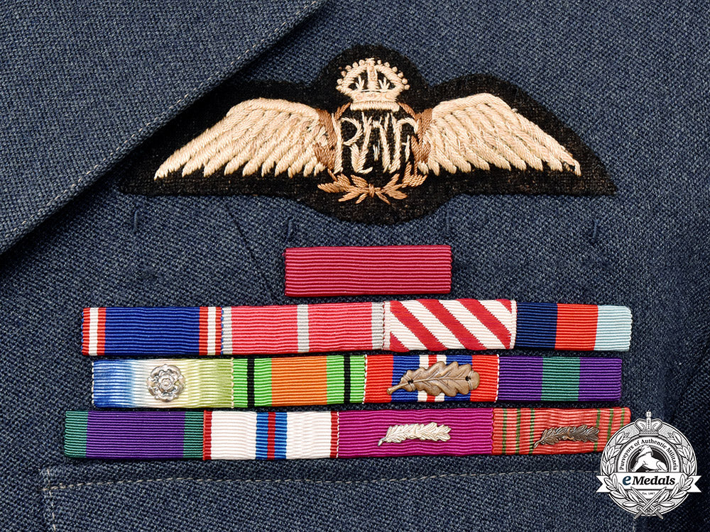 The tunic is fabricated from a grayish-blue wool-cotton blend, each of the shoulders adorned with a shoulder board bearing the crowned ERII cypher and held in place at the neck end via a silvered button, each of which bears a crown above the RAF eagle, with the stitching securing the board on the left shoulder having come away at the shoulder end. The front has five pockets, one on each breast which have decorative straps giving them a pleated-look, along with two larger ones at the waist, all four pockets with a fold over flap with silvered buttons, each of which bears a crown above the RAF eagle and maker marked "GAUNT LONDON", the two breast pockets also with dual snap closures added. An additional small flap-less pocket appears between the two right side pockets. Above the left pocket, is a King's crown Royal Air Force Pilot's badge, in white and brown embroidery, on a black wool base, with a four-level Ribbon Bar immediately below (Most Honourable Order of the Bath / Royal Victorian Medal; Most Excellent Order of the British Empire, Military Division; Air Force Medal; and 1939-1945 Star / Atlantic Star with Silver Rosette; Defence Medal; War Medal 1939-1945 with MID Oak Leaf; and General Service Medal 1918-1962 / General Service Medal 1962-2007; Queen Elizabeth II Silver Jubilee Medal 1952-1977; Belgium: Order of the Crown with Silver Palm; and Belgium: Croix de Guerre 1940 with Bronze Palm). The left breast pocket has two horizontal loops sewn in place, one above the other, where an award previously existed. The front is completed by a vertical row of three large silvered buttons on the right side, each of which bears a crown above the RAF eagle and is maker marked "GAUNT LONDON". A smaller plain copper-finished button appears just below the last button and is maker marked "PITT & Co.". All four buttons face an equal number of reinforced buttonholes on the left side. There are two thin gray straps on sewn in place on either side at the rear, along with a brass hook above the left waist pocket, which support a wide grayish-blue wool-cotton blend belt, the left end housing a large silvered metal dual prong buckle, the right end with three rows of two holes each to be fed through the buckle, allowing for an adjustable fit, and aided by a snap closure. Each cuff bears the rank piping of an Air Chief Marshal, the tunic single-vented at the rear.