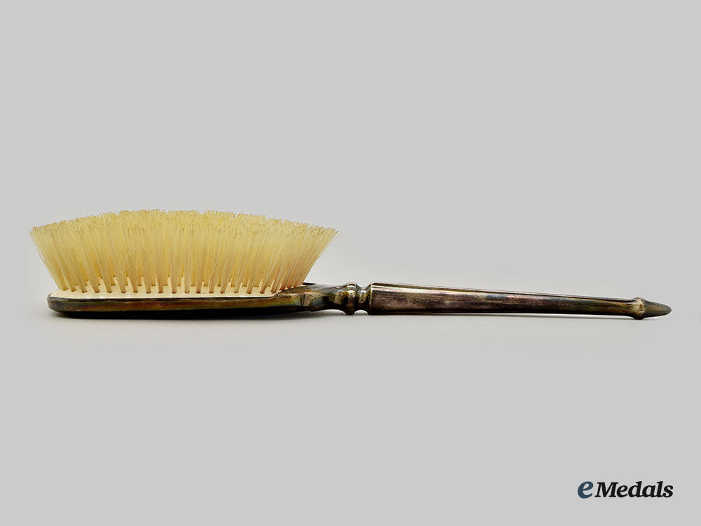 Silver. (Vintage). A hand held silver horsehair brush with silver detailing, bristled into enamel base, stamped with mark for silver, date mark for 1939 under the reign of George VI, with the city mark for Birmingham and Maker’s Mark for Charles S. Green & co, measures 4.5cm (w) x 16.5cm (l) x 3cm (h), weighs74.2 grams, bristles slightly frayed, lovely patina, in very fine condition.