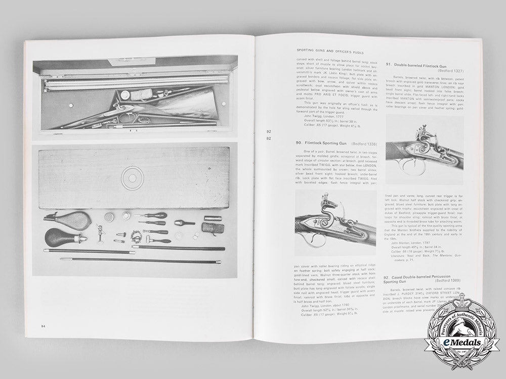 A well-preserved edition of “Early Firearms of Great Britain and Ireland”. The book is constructed of a card stock binding, with the exterior cover bearing a full-colour photograph of a cased set of duelling pistols, topped by the title. The interior content consists of 187 paper stock pages featuring detailed descriptions of a variety of pistols and rifles, supplemented by black-and-white photographs. The collection is an assemblage of items compiled by Clay P. Bedford. It was published in 1971 by The Metropolitan Museum of Art of New York. The book measures 215 mm (w) x 278 mm (h). Minor material fatigue is evident, and the book is in an overall near extremely fine condition.