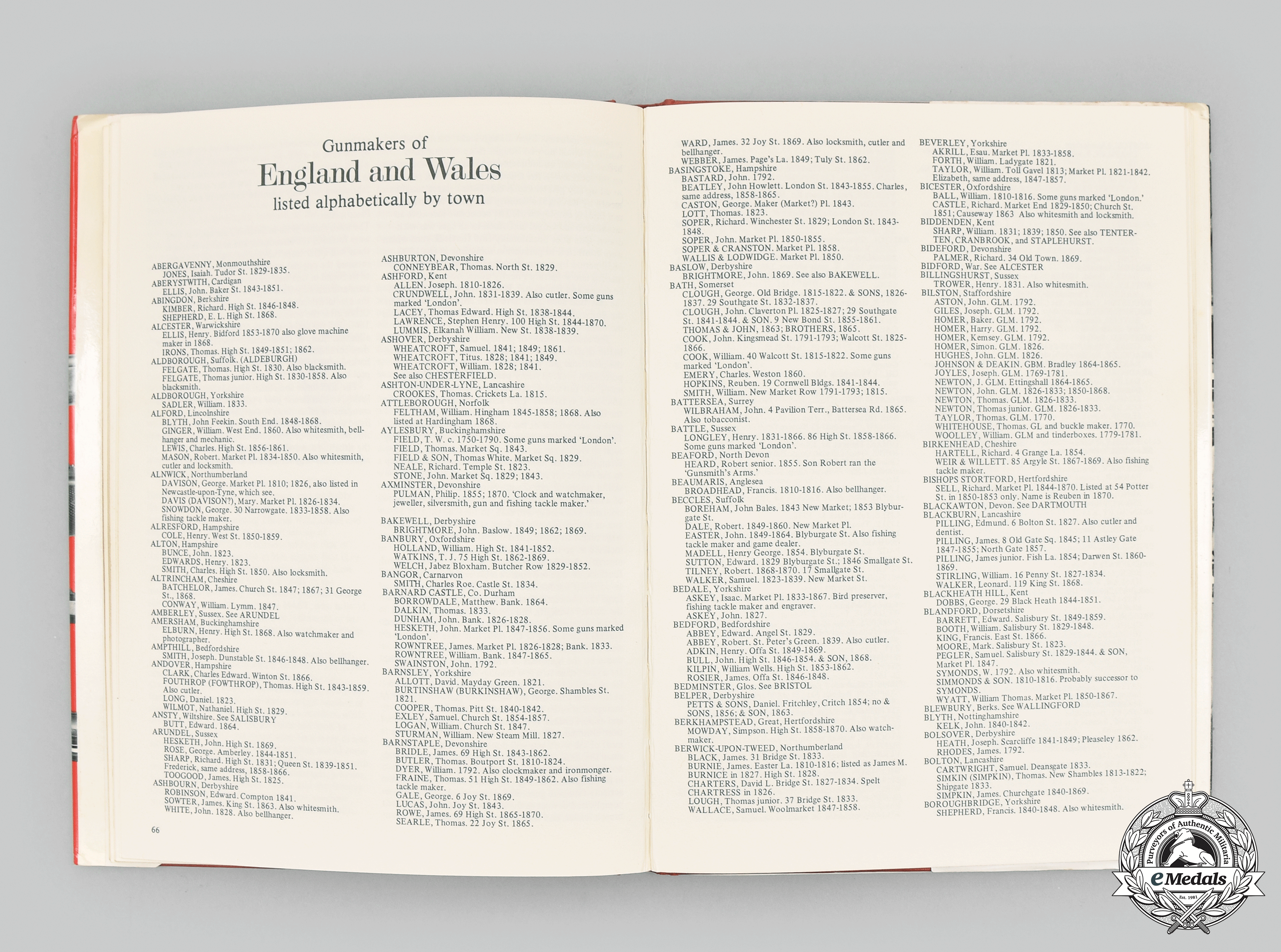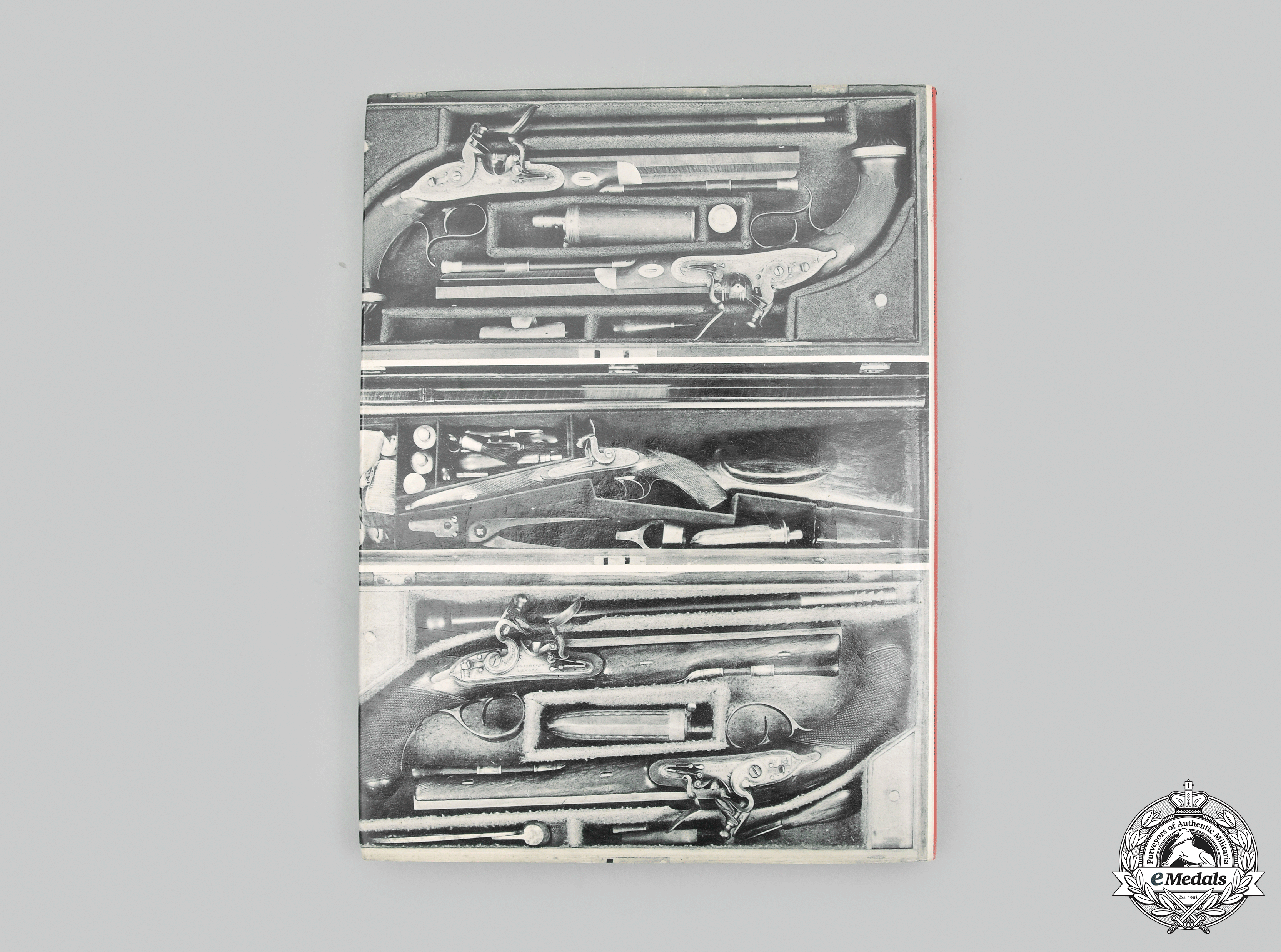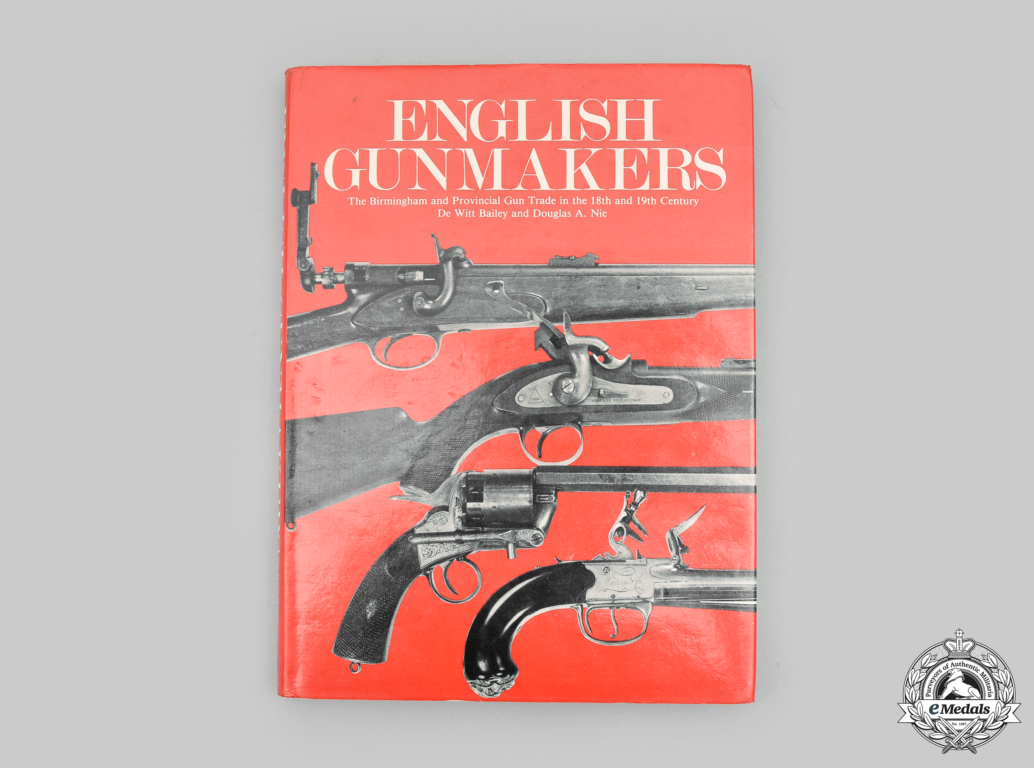 Hardcover, crimson red cloth cover, with dust jacket, the text on the spine in gold-coloured ink, entitled "English Gunmakers - The Birmingham and Provincial Gun Trade in the 18th and 19th Century", by De Witt Bailey and Douglas A. Nie and copyrighted by the authors in 1978, published by Arms and Armour Press of London, Lionel Leventhal Limited, edited by Tessa Rose, designed by David Gibbons, typeset by Trade Linotype Limited of Birmingham, printed and bound by William Clowes & Sons Limited of Beccles, Suffolk in 1978, ISBN 0-85368-212-7. Very fine.