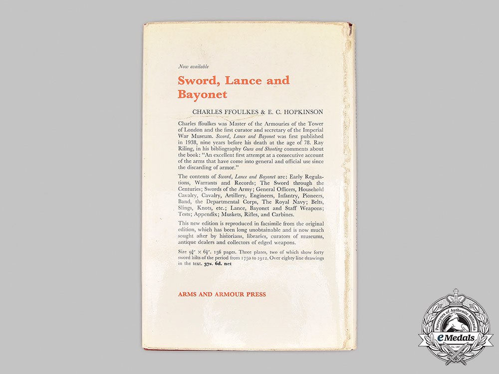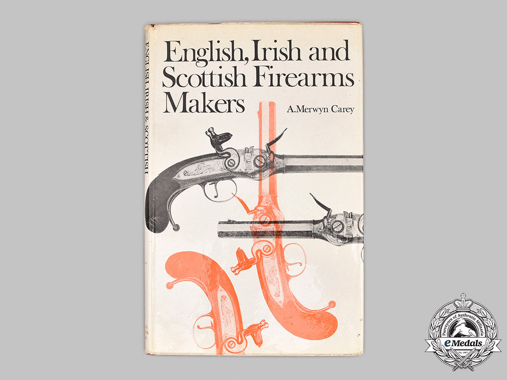 Hardcover, maroon cloth cover, with dust jacket, the text on the spine in gold-coloured ink, entitled "English, Irish and Scottish Firearms Makers - When, Where, and What They Made - From the Middle of the Sixteenth Century to the End of the Nineteenth Century", by A. Merwyn Carey, copyrighted by the author in 1954 and 1967, published by Arms and Armour Press of London, first edition in 1954, first British edition in 1955, second British edition in 1967, this edition reproduced from the 1954 original by kind permission of the Thomas Y. Crowell Company, printed in England by Photolithography by Unwin Brothers Limited of Woking and London, dust jacket design by Bill Payne. As noted on the dust jacket: "This book represents thirty-three years of careful and diligent research, collecting and inspecting old firearms. Over one hundred pages present a valuable detailed biographical encyclopaedia of English, Irish and Scottish Firearms makers. This section contains more than one thousand seven hundred and fifty entries, alphabetically listed. Each entry gives the name of the maker, the span of years he was active, and the town or city - with the shire or county - where he was located. It covers the type of known arms made - both long and short arms - and those made under royal government contract as well as custom made. Where important makers are listed, the material is considerably expanded to cover a complete summary of their activities and their place in British firearms history. Three appendices provide a Chronology of English, Irish and Scottish Firearms, Reigns of England, and a Bibliography. This new edition (1967) is reproduced in facsimile from the original edition, which has long been unobtainable and is now much sought after by historians, libraries, curators of museums, antique dealers and collectors of firearms." It begins with an Introduction by Edward Wenham, followed by a Foreword by A. Merwyn Carey, a Table of Contents and a List of Illustrations. The bulk of the book contains over 1,750 Biographical Cyclopedia of English, Irish and Scottish Firearms Makers, presented alphabetically, and finishes with ten plates of photographs. It concludes with three pages of Notes, a Schedule of Gun Proof Marks Registered in England, a two page Appendix, a List of the Monarch Reigns of England and a two page Bibliography. The book contains 140 pages of text, along with ten photographs, printed in black ink, on a white paper stock, measuring 155 mm (w) x 245 mm (h) x 14 mm (d). It exhibits light wear and repair on the dust jacket, however, the pages and the cover of the book remain pristine. Near extremely fine.