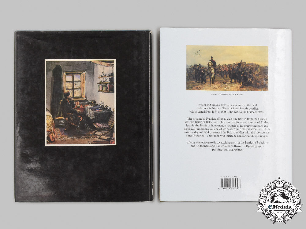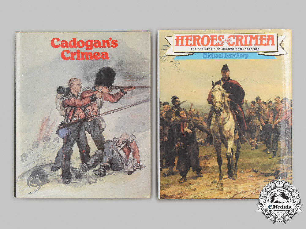 1. "Cadogan's Crimea" written by Lieutenant Colonel Somerset J. Gough Calthorpe, illustrated by General the Honourable Sir George Cadogan K.C.B.: hardcover, sapphire blue cloth cover, the text on the spine in gold-colored ink, with dust jacket, first published under the title " 'Letters From Headquarters' by a Staff Officer", this abridged and illustrated edition first published in 1979 by Hamish Hamilton Limited of London, copyrighted by Editor Books LImited of Croydon, Surrey in 1979, printed by Ebenezer Baylis and Son Limited, The Trinity Press of Worcester and London, bound by Webb Son & Company Limited, ISBN 0 241 10232 4. As stated on the dust jacket: "If all conflicts of arms were to be regarded as pointless bloodletting, then the war in the Crimea might be the most likely event to head a long list. Willam Howard Russell, the famous war correspondent of "The Times", was full of condemnation while viewing the spectacle of carnage 'from the wings', so to speak. Colonel the Hon. George Cadogan saw the war as a participant, and recorded his observations in pictures while on the battlefield. His superb watercolours, carefully arranged in a large album which has been kept treasured by his family, present the Crimean War from a soldier's point of view - sometimes horrifying, sometimes whimsical, sometimes sentimental, but at all times true to the prevailing atmosphere and events of the period. The text is an abridged version of "Letters from Headquarters" by Lt. Col. S.J.G. Calthorpe, an officer of the Headquarters Staff, which was first published in two volumes in 1856 by John Murray and had two further editions in 1857 and 1858. Cadogan's fellow officer had published his impressions of the war primarily in defence of the one man for whom he declared a boundless admiration - the much-maligned leader of the Expeditionary Force, Lord Raglan. The writer's powers of observation combine the horror and dignity of war with charm and humour - witness the story of the spy who was to be 'comfortably' hanged in the morning, or the occasion when Lord Raglan ordered up a troop of horse artillery and battery fire on the Russians. The author records: 'If one had not seen the cannon-balls coming along at the rate of a thousand miles an hour, and bounding like cricket-balls, one would have thought it only a little cavalry review.' Nostalgia provides an element of dash and daring which, to the many students of wars and military history, is perhaps part of the appeal of their chosen subject. During the Crimean War, for example, dress uniforms were used in battle and occasionally an officer, a lady on his arm, strolled across the heights above a battlefield showing her where he would be attacking in the morning. All this is shown in the illustrations. The superimposing of these brilliant yet delicate watercolours by one serving officer upon a vivid narrative by another allows the modern reader a unique view of the Crimean War. This is art and military history combined to extraordinary effect." It begins with a Table of Contents, followed by an Acknowledgements and a Foreword by The Earl Cadogan. It is divided into sixteen chapters: 1. Start of the Expedition; 2. Battle of Alma; 3. Surrender of Balaklava; 4. Defences of Sevastopol; 5. Captain Nolan and Lord Lucan; 6. Battle of Inkermann; 7. Russian deserters; 8. Onset of winter; 9. No progress either side; 10. Attack on Eupatoria; 11. Councils of war; 12. Capture of ambuscades; 13. General Canrobert resigns; 14. Assaults on enemy positions; 15. Death of Lord Raglan; 16. The fall of Sevastopol. It concludes with five Appendices and an eight page Index. The book contains 288 pages of text, charts and artwork photographs, printed in black ink, with four-colour plates interspersed throughout, on a thick white paper stock, measuring 192 mm (w) x 245 (h) x 26 mm (d), exhibiting foxing on the top edges and slight undulation, better than very fine.