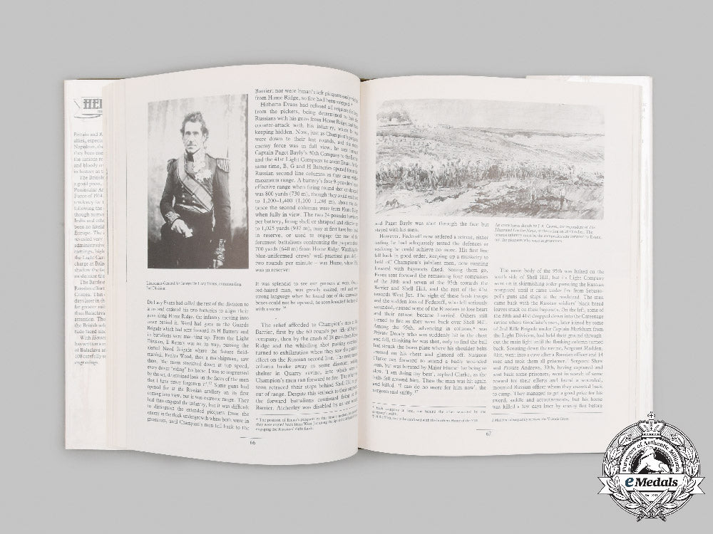 2. "Heroes of the Crimea: The Battles of Balaclava and Inkerman by Michael Barthorp: hardcover, olive green cloth cover, the text on the spine in gold-colored ink, with dust jacket, copyrighted by the author in 1991, published by Blandford - an imprint of Casell Villiers House of London in 1991, typeset by Bookworm Typesetting, printed and bound in Great Britain by Bath Press of Avon, ISBN 0 7137 2102 2. As stated on the dust jacket: "Britain and Russia have been for the most part, allies, especially in the great wars against Napoleon, The Kaiser and Hitler. Only once have they been enemies with the differences between the nations resolved by force of arms. This stark and bloody conflict from 1854 to 1856 is known as the Crimean War. The British Army in the Crimea has not had a good press, compared with Welington's Peninsular Army or the later Expeditionary Force of 1914. Undoubtedly there has been a tendency for the Army to rest on its laurels following the defeat of Napoleon. Moreover, though numerous campaigns had been fought in India and other colonies since 1815, there had been no likelihood of the Army being tested in Europe. The Army that went to war in 1854 revealed very serious command, staff and administrative failings. However, these shortcomings, highlighted by such famous follies as the Light Cavalry Brigade's gallant but futile charge at Balaclava, have been allowed to overshadow the fact that much was being done to modernize the Victorian Army. The Battle of Balaclava heralded the first major Russian effort to eject British from the Crimea. This counter-offensive culminated 11 days later in the Battle of Inkerman, a struggle of far greater military and historical consequence than Balaclava yet one which has received far less attention. Those autumn days of 1854 presented the British soldier with the severest test of fortitude faced since Waterloo." It begins with a Table of Contents, a List of Maps and a Preface. It is divided into four parts, each of which contains two or three chapters: Part I: To Thwart the Russian Bear (1. Cheer, Boys, Cheer!; 2. A Blow at Sebastopol); Part II: The Bear Strikes Back (3. The Trumpet, the Gallop, the Charge; 4. The Minie's Murderous Effect; 5. The English Shall Be Attacked); Part III: The Soldiers' Battle (6. Facing Fearful Odds; 7. Load, Fire and Charge!; 8. A Hell of a Towelling); Part IV: (9. The Reckoning; 10. Noble Exertions). It concludes with two Appendices, a List of Sources, Picture Credits, References and a four page Index. The book contains 160 pages of text, maps, artwork and field photographs, printed in black ink, on a white paper stock, measuring 192 mm (w) x 252 (h) x 16 mm (d), near extremely fine.
