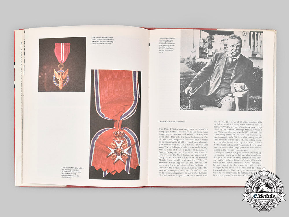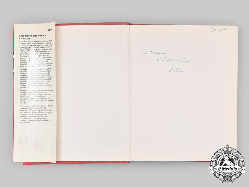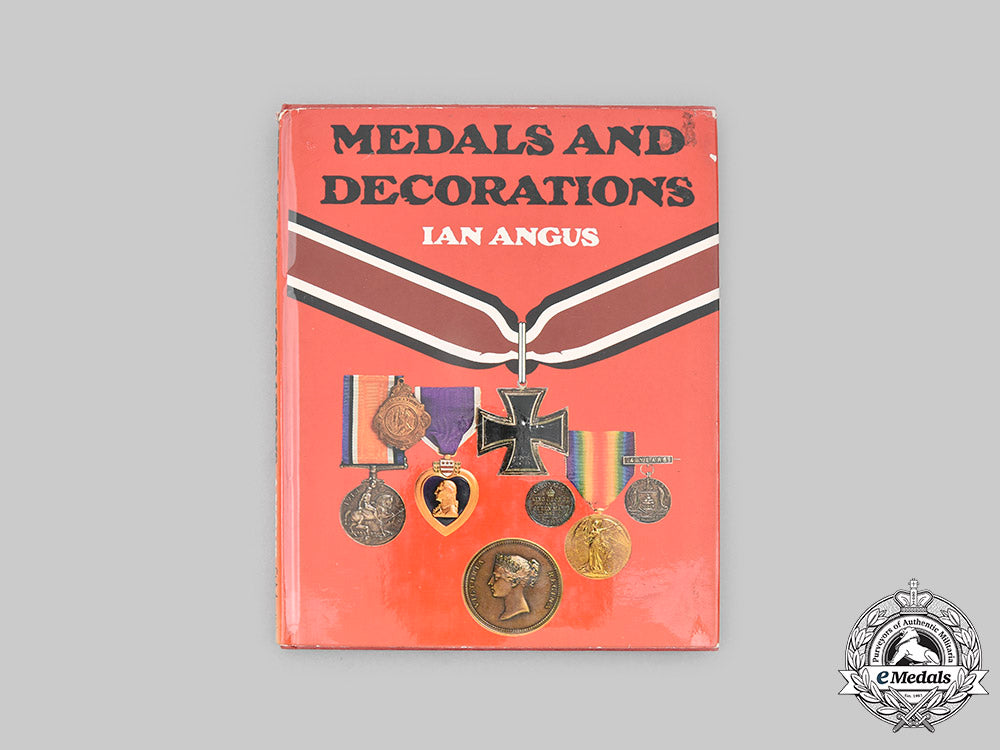 Hardcover, red cloth cover, with dust jacket, entitled "Medals and Decorations" by Ian Angus, published in Great Britain by Ward Lock Ltd. of London, first published in the United States of America by St. Martin's Press of New York, N.Y., printed in Spain, copyrighted in 1973. This book is best described as a general reference guide for collectors of the various orders and decorations of the world, through the use of descriptive text and multiple photographs, featuring many of the prominent and well-known awards, even touching on some of the lesser known awards. Also, pins, badges and ribbons are explored, the book accented with key figures and historical events through the use of descriptive narratives and illustrations. It is divided into eleven sections under the headings: The Origin of Medals; British Campaign Medals; Other Campaign Medals; Gallantry Awards; Other Military Medals; Orders of Chivalry; Civil Decorations; Commemorative Medals; Pins and Badges; Medal Ribbons and Embellishments; Collecting Medals and Decorations; and concludes with a two page Index. It gives the would-be collector a good overview, as to what to collect, how to house the collection, along with the proper care of the pieces. The book contains 128 pages, printed in black ink, on a thick off-white paper stock, with four colour plates, two inserted between pages 48-49, the other two between pages 64-65, both printed in full colour on a bright white paper stock, measuring 207 mm (w) x 265 mm (h) x 17 mm (d). There is a personalized and dated inscription on the free end paper at the front, the dust jacket with sunning evident on the spine, along with creasing on the left panel where it wraps around to the inside of the book, however, the pages and cover of the book remain pristine. Near extremely fine.