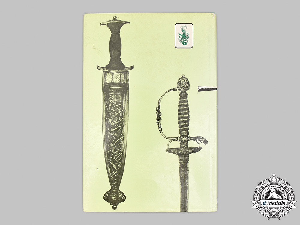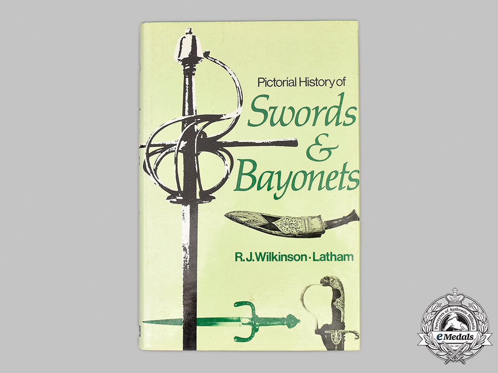 Hardcover, emerald green cloth cover, with dust jacket, the text on the spine in silver-coloured ink, entitled "Pictorial History of Swords & Bayonets", by Robert J. Wilkinson-Latham, copyrighted by the author in 1973, published by Ian Allan Limited of Shepperton, Surrey in 1973, printed in the United Kingdom by Morrison and Gibb Limited of London and Edinburgh, dust jacket design by Ian Allen Studio, ISBN 0 7110 0394 7. As noted on the dust jacket: "This book traces the evolution of swords, bayonets, dirks and daggers from their beginning until 1918. The detailed text describes and follows the history of the sword, from the bronze and iron swords of the years before Christ, through the Roman, Viking and Saxon weapons; the swords of the Crusades; the elegant thin bladed rapier and the gentleman's 'Town' or small sword of the 18th century. The military sword is described in detail from the time of the formation of the first professional armies in Europe, through the various improvements and changes in style until the technically designed weapons of the 20th century. Each type, whether infantry, cavalry or navy is discussed and the various patterns of some of the leading powers traces until 1918, when the sword was no longer regarded as an effective weapon of war and relegated to ceremonial occasions. The evolution of the bayonet is traced from its uncertain beginning, and the large variety of locking devices and patterns of sword bayonet of some of the leading powers are followed in detail. The knife, dirk and dagger are also fully discussed. Native and non-military swords and daggers are included and the main types and styles described. Photographs and drawings illustrate some 400 swords, 170 bayonets and 165 dirks, daggers and knives, all of which have been selected to complement the text. Line drawings show makers' marks and typical examples of blade decoration. Many of the weapons are here illustrated for the first time. This pictorial history is the ideal work of identification and reference to the collector and provides the general reader with a fascinating survey of the evolution of some of man's oldest weapons." The first half of the book is text and line drawings. It begins with an Introduction by the author, the book itself divided into three sections, each with multiple areas under subheadings: 1 - Swords (Evolution and History up to 1750; Swords of Europe 1750-1918; Swords of America 1770-1918; Swords of Asia Including Russia 1800-1918; Swords of India 1850-1918; Non-Military and Native Swords); 2 - Dagger, Knives and Dirks (Evolution and History up to 1750; Scottish Dirks; Naval Dirks; Other Daggers and Knives); 3 - Bayonets (Evolution and History up to 1750; Bayonets of Europe 1750-1918; Bayonets of America 1770-1918; Bayonets of Asia Including Russia 1800-1918). It concludes with a two-page Appendix, a List of Illustration Credits, a Bibliography and a four-page Index. The second half of the book features 300 plates of black and white photographs, each with an identification tagline. The book contains 96 pages of text and line drawings, printed in black ink, on a white paper stock, while the 128 pages of photographic plates are printed in black ink, on a semi-coated paper stock, a total of 428 pages of text and photographs, measuring 155 mm (w) x 235 mm (h) x 20 mm (d). Near extremely fine.