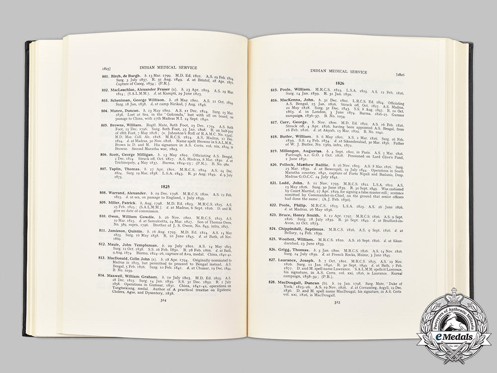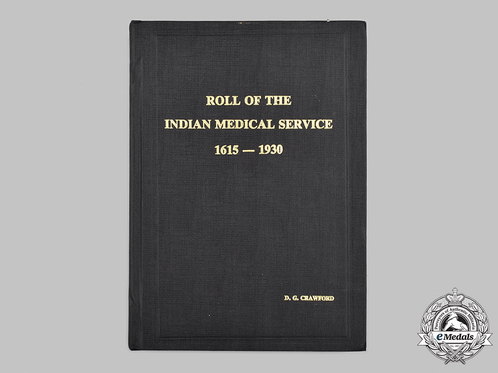 Hardcover, black cloth cover, entitled "Roll of the Indian Medical Service 1615-1930", compiled by Lieutenant-Colonel Dirom Grey Crawford, Bengal Medical Service, Retired, published by W. Thacker and Company of London in 1930, printed in Great Britain by William Clowes & Sons, Limited of London and Beccles. The book is marked "This is a limited edition of 200 copies" and is dedicated "To the memory of the thousands forgotten, of the few faintly remembered, who, during the past three centuries, have served their King and Country in the Indian Medical Service, these brief records of their careers are dedicated." It begins with a Preface, followed by an Addenda et Corrigenda, a Table of Contents, a List of Abbreviations and an Introduction that states that the "introduction is a continuation of the History of the IMS and consists partly of notes on the events and changes of the past fifteen years, partly of supplementary information about former times, which has come to hand since the History was published." The majority of the book deals with the Roll of the Indian Medical Service, containing the names of 6,156 officers, each chapter with the names of the individuals in boldface type, in order by date, with a brief biography that includes the individual's respective service where known. It is divided into nine chapters: I - Bengal, 1645-1896, with Appendix I, Bengal, Extra Names; II - Madras, 1630-1896, with Appendix I, Madras, Extra Names; III - Bombay, 1613-1896, with Appendix I, Bombay, Extra Names; IV - General List, 1897-1930; V - Eastern Factories, 1605-1775; VI - Sumatra or West Coast, 1696-1825; VII - St. Helena, 1684-1831; VIII - China, 1763-1834; IX - Prince of Wales Island. It concludes with twelve Appendices (II - List of Officers Killed in Action; III - List of Officers who also Served as Combatants; IV - List of Officers who also Served in Colonial Services; V - List of Examining Physicians, and Presidents Medical Board; VI - List of Officers, Successfully Senior on Retired List; VII - Strength of Service, 1915-1930; VIII - Table of Honours and Rewards; IX - Analysis of Degrees and Diplomas: Bengal, Madras, Bombay, General List; X - Analysis of Medical Schools: Bengal, Madras, Bombay, General List; XI - Analysis of Birthplaces Bengal, Madras, Bombay; XII - Analysis of Parentage, Bengal, Madras, Bombay; XIII - Analysis of Final Results, Bengal, Madras, Bombay) and a fifty-five page Index. The book contains 764 pages of text, printed in black ink on a white paper stock, weighing 1.5 kilograms, measuring 180 mm (w) x 252 mm (h) x 50 mm (d). The top of the pages exhibit foxing, with light soiling present on the side and bottom edges of the pages, in addition to a small nip in the cloth covering on the top edge of the front cover, the pages themselves remaining unaffected. Better than very fine.