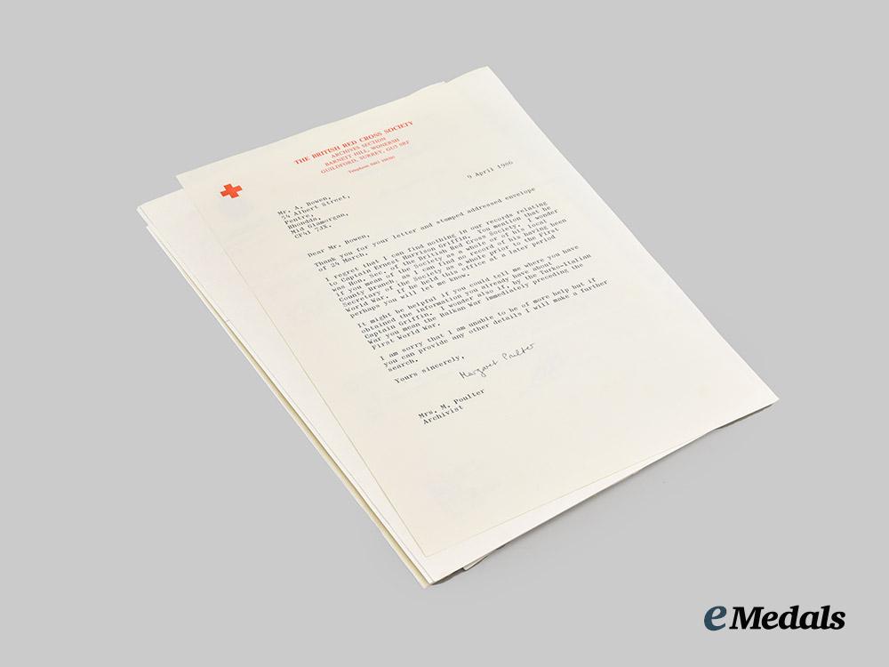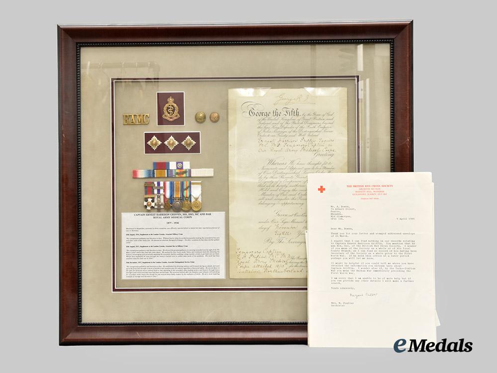 This excellent presentation of Captain Ernest Harrison Griffin’s war decorations and awards displays, on one side, a letter printed and handwritten, which nominates and appoints Ernest Griffon to be a member of the Distinguished Service Order on the 26th November 1917. Alongside the letter, there is a grouping of war decorations and insignia which includes: a RAMC shoulder title badge; a RAMC cap badge; two RAMC cuff buttons; three RAMC rank pins; a medal bar; miniatures of high quality including a Distinguished Service Order; A Military Cross; A 1914-1915 Star; A British War Medal; A Victory Medal with an oak leaf clasp; and a British Red Cross Society Medal For War Service. The case with a modern frame measures 56 cm (h) x 61 cm (w) and is in mint condition.