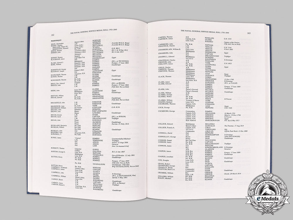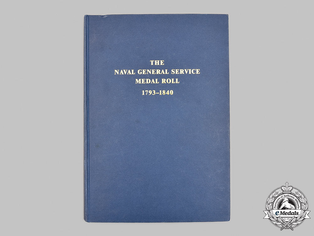 Hardcover, sapphire blue cloth cover, the text on the front cover in gold-coloured ink, entitled "The Naval General Service Medal Roll 1793-1840", re-published (list only) by the London Stamp Exchange, undated but known to have been published in 1987, the author's name unstated, using the original content of Captain Kenneth J. Douglas-Morris, D.L., R.N. book of the same name published in 1982, printed in Great Britain by Antony Rowe Limited of Chippenham, Wiltshire, England. The book is organized by date and states the clasp that was issued, with a brief description of the action it was awarded for, along with the number of recipients of the award. The accompanying list of recipients is listed alphabetically, each listing stating the recipient's rank(s), the ship(s) he served with, and other clasp(s) issued to him for the medal. It begins immediately on page 1 with the first recipient, the Honourable Frederick W. Aylmer, who was in action on March 15, 1793, participating in a successful attack on the French trenches before Willemstadt by boats of Syren and other gun-boats. The last entry in the book acknowledges the 6,978 recipients of the Naval General Service Medal with the Syria clasp, issued for operations on the coast of Syria from September 10, 1840 until surrender of Acre on November 4, 1840, and the blockade of Egyptian ports September/December 1840. It concludes with a one page List of Abbreviations and a three page Index. The book contains 404 pages of text, printed in black ink, on a white paper stock, the name of the publication's previous owner stamped in black ink on the inside front cover endpaper, measuring 210 mm (w) x 302 mm (h) x 34 mm (d), accompanied by photocopied list of clasps. It exhibits a small indentation along the top edge of the front cover, however, the pages within remain pristine. An invaluable resource to historians and collectors, along with being an easily accessible record for the descendants of the recipients. Near extremely fine.