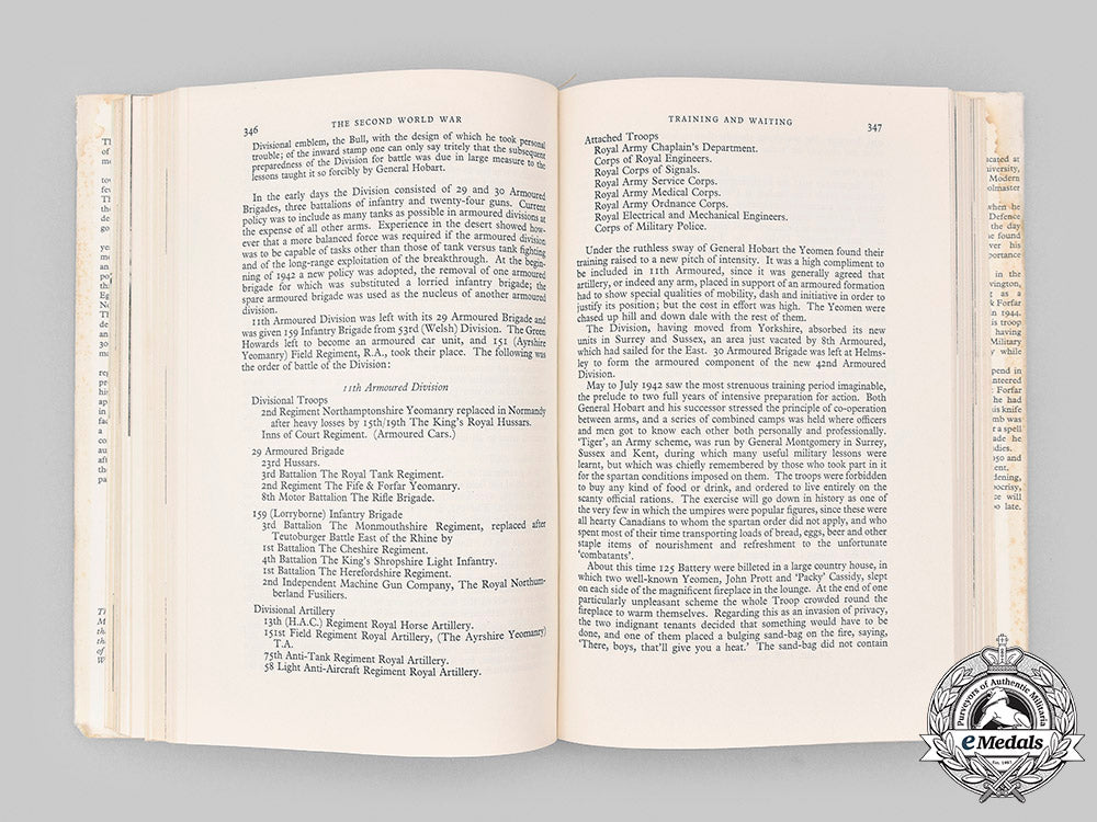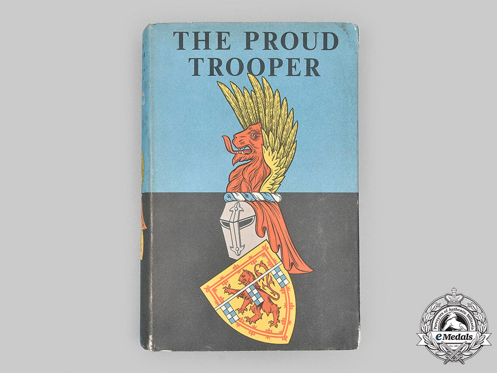 Hardcover, teal blue cloth cover, silver embossed regimental insignia on the front cover, with dust jacket, entitled "The Proud Trooper - The History of the Ayrshire (Earl of Carrick's Own) Yeomanry from its raising in the Eighteenth-Century till 1964" by Major W. Steel Brownlie, MC, TD, MA, published by Wm. Collins, Sons & Co., Ltd. for the Ayrshire Yeomanry, bound in two-tone linson, supplied by R. & W. Watson, Ltd., Linwood, Scotland, printed in Great Britain by Robert Cunningham and Sons Ltd., Longbank Works, Alva in 1964. It is "dedicated to those who in peace or in war have helped to make the Ayrshire Yeomanry something to be proud of." It is divided into four sections entitled: 1. The Early Days (with three chapters); 2. The South African War (with five chapters); 3. The First World War (with five chapters); 4. The Second World War (with ten chapters). It concludes with a Regimental roll, a Roll of Honour, Honour and Awards, followed by nine Appendices and an Index. As described on the dust jacket: "This book tells the story of the Ayrshire (East of Carrick's Own) Yeomanry, the senior regiment of Scotland's auxiliary forces. In the Ayrshire of Robert Burns, one day towards the end of the eighteenth century, a few local farmers visited the Earl of Cassillis. They said that if he would take command of them, they would form a troop of horse for the defence of the district, "free of all expense to government." That was the beginning. In the intervening years the Yeomen have served as cavalry, mounted infantry, infantry, gunners, and tank and reconnaissance troops. Having acted as riot police in the turbulent Radical days, they fought through three wars, in South Africa, in Gallipoli, Egypt, Palestine, Flanders, Tunisia, Italy, Normandy, Belgium, Holland and Germany. This book follows all these campaigns in full detail, with a wealth of maps and illustrations, and an ample index including references to some 300 units and formations with which the Yeomanry has been associated. Going far beyond the scope of the usual regimental history." It contains 640 pages, the text, line drawings and maps printed in black ink, with various black and white, along with colour plates, inserted at select intervals throughout, measuring 155 mm (w) x 235 mm (h) x 37 mm (d), small stain present on the side edges of the pages on the exterior, foxing evident on the dust cover. Better than very fine.