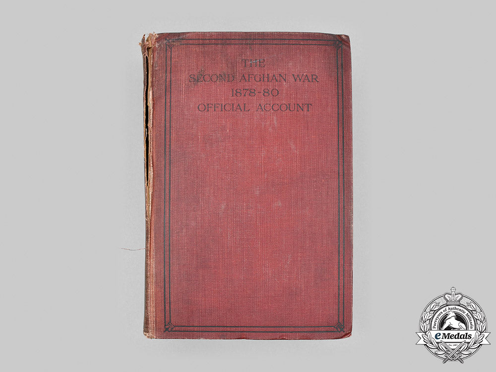 Hardcover, cherry red cloth cover, entitled "The Second Afghan War 1878-80 - Abridged Official Account, Produced in the Intelligence Branch, Army Head-Quarters, India", published by John Murray of Albemarle Street, W., London, printed by Hazell, Watson and Viney, Limited of London and Aylesbury, in 1908. It begins with a Preface, followed by a List of Contents, a List of Illustrations (totalling 35) and a List of Maps and Plans (totalling 22). It is divided into twenty chapters: I - Preparation for a Campaign in Afghanistan from the Autumn of 1876 to 20th November, 1878; II - Operations of the Peshawar Valley Field Force, November and December, 1878; III - Operations of the Peshawar Valley Field Force from January to June, 1879; IV - Operations of the Kurram Valley Field Force from November, 1878, to July, 1879; V - Operations of the Southern Afghanistan Field Force from October, 1878, to August, 1879; VI - Events from the Peace oh Gandamar to the Massacre of the Kabul Embassy; VII - The Second Campaign. Advance of the 1st Division, Kabul Field Force, and Occupation of Sherpur, to December 1st, 1879; VIII - Events at Kabul during December, 1879; IX - Operations in the Kurram District, from Sir Frederick Roberts's Advance to Kabul, September 26th, 1879, to End of the Year; X - Operations on the Khyber Line, September to December, 1879; XI - The Movements of the Kandahar Field Force from September, 1879, to March, 1880; and the March of the Ghazni Field Force under Sir Donald Stewart from Kandahar to North Afghanistan; XII - The Operations of the 1st Division, Kabul Field Force, from January to April, 1880; XIII - Operations of the Northern Afghanistan Field Force, under Sir Donald Stewart, from May to September, 1880; XIV - Operations and Movements on the Khyber Line from the 1st January, 1880, to March, 1881; XV - Operations in the Kurram District from January to October, 1880; XVI - The Bombay Division in Southern Afghanistan, from the Beginning of April to the End of August, 1880; XVII - The March of the Kabul-Kandahar Force under Sir Frederick Roberts, and the Battle of Kandahar; XVIII - The Measures for the Relief of Kandahar from Quetta, and the March of General Phayer's Force; XIX - Affairs in Southern Afghanistan from the 9th September to the 31st December, 1880; XX - The British Force in Southern Afghanistan from January, 1881, to the Final Withdrawal from Kandahar. It concludes with forty Appendices, a ten page Index, the last eight pages devoted to promoting other publications. The book contains 752 pages of text, complemented by twenty-two pull out maps (most of which are in colour), the text and maps on a newsprint-like paper stock, along with multiple pages of black and white illustrations/photographs inserted at thirty-five locations throughout the book, on a semi-coated white paper stock, with gold-leaf on the top of the pages, weighing 1.5 kilograms, measuring 155 mm (w) x 232 mm (h) x 60 mm (d). The cover has experienced age soiling, with a large tear present where the spine butts the front cover, the inside front and back cover papers have yellowed, as has the side and bottom edges of the pages, the side pages exhibiting a moisture mark, the book retaining all its maps, most of which remain attached to the body of the book, however, a few have separated from it and are in torn condition, the text of the book remaining crisp and legible. Fair.
