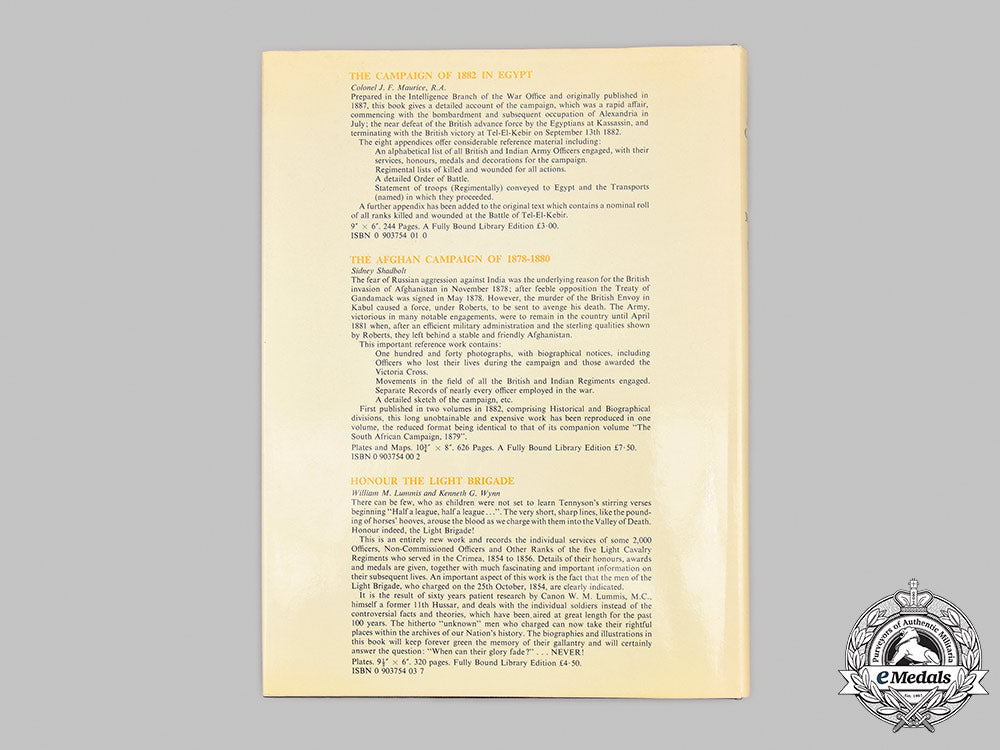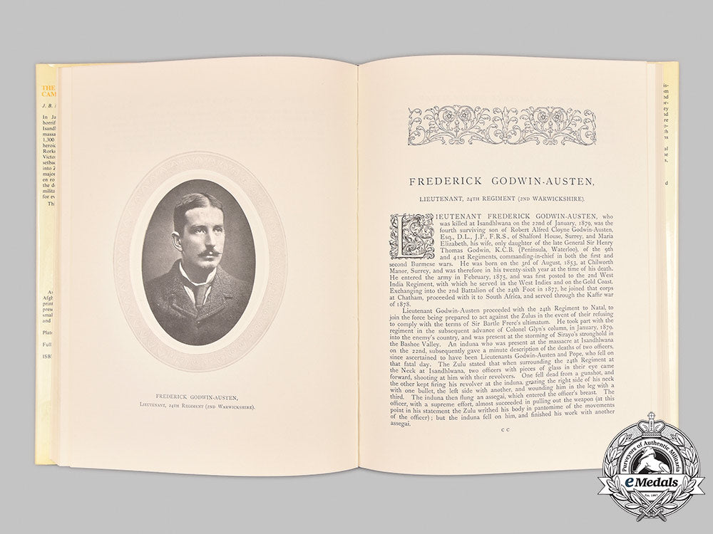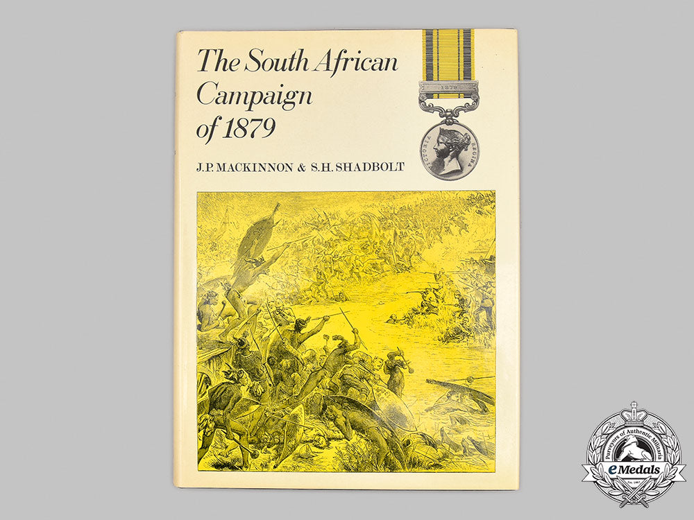 Hardcover, black cloth cover, with dust jacket, the text on the spine in gold-coloured ink, entitled "The South African Campaign of 1879", complied by J.P. MacKinnon, late 25th King's Own Borderers, formerly 72nd Highlanders and Sydney L. Shadbolt of the Inner Temple, Barrister-At-Law, dedicated to Field-Marshal H.R.H. The Duke of Cambridge, Commanding-in-Chief, originally printed and published in 1882 by J.B. Hayward & Son of London, reprinted in 1973 by Eyre & Spottiswoode Limited at Grosvenor Press in Portsmouth, ISBN 0 903754 02 9. As stated on the dust jacket: "In January 1879, Victorian Britain was horrified by the news of the disaster at Isandhlwana, where the Zulus surprised and massacred a British Army column of over 1,300 men. The defeat was followed by the heroic defence of the mission station at Rorke's Drift where no less than eleven Victoria Crosses were won. After minor setbacks, British columns rapidly advanced into Zululand and after fighting a number of major battles, occupying strategic positions en route, they subsequently fought and won the decisive battle of Ulundi, where the real military power of the Zulu nation was ended forever. This volume contains: cabinet photographs and biographical notices of sixty-two officers of the British Army and Navy who lost their lives during the campaign, including that of Lieutenant Thirkill of the 88th Regiment, which did not appear in the original edition of 1880; summaries of all the British Regiments and Naval Brigade in the field; separate records of almost every British officer engaged; accurate accounts of the various engagements; maps etc. As with its companion volume "The Afghan Campaign of 1878-1880" modern printing techniques have made it possible to present this volume in a reduced format. This smaller size is more convenient for reference and storage." It begins with a Preface, followed by a List of Contents and a thirty-two page Introduction. The bulk of the book entails Portraits and Biographical Notices of the Sixty-Two Officers of the British Army who Lost Their Lives in the Zulu War. It concludes with Records of the Services of Every Officer of the British Army who was Engaged, and a two-page Index. The book contains 386 pages of text, printed in black ink, on a semi-coated white paper stock, with two maps on a white coated stock (Zululand showing the Movements of the Columns and Divisions in the Field inserted facing page 1, and Action at Isandhlwana inserted facing page 11), measuring 203 mm (w) x 272 mm (h) x 27 mm (d). It exhibits foxing along the top edge of the pages, however, the pages within remain unaffected. Near extremely fine.