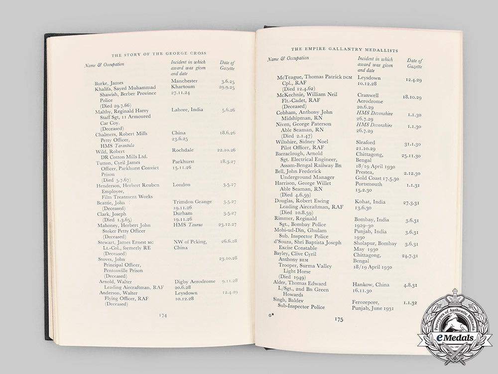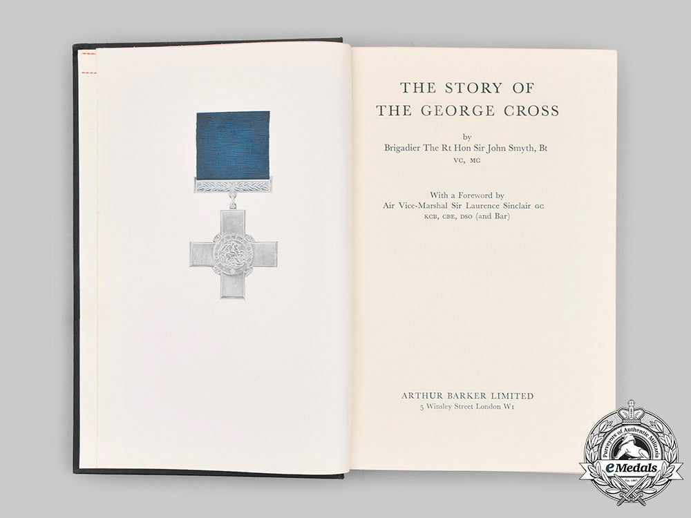 Hardcover, black cloth cover, the text on the spine in gold-coloured ink, entitled "The Story of the George Cross", by Brigadier The Right Honourable Sir John Smyth, VC, MC, copyrighted by the author in 1968, published by Arthur Barker Limited, printed in Great Britain by Ebenezer Baylis & Son, Limited, The Trinity Press of Worcester and London, SBN 213 76307 9. As stated in the Introduction: "On September 23, 1940, King George VI announced, in a broadcast to the nation, the creation of a new, and very high, decoration for gallantry which was to be called the George Cross. It was to rank next to the Victoria Cross and to be awarded to men and women for acts of supreme gallantry. The Cross was intended primarily for civilians and its award to members of the Armed Forces was to be confined to actions for which purely military honours were not normally granted. All the King's subjects in the British Commonwealth and Empire were to be eligible for the award and, as in the case of the Victoria Cross, provision was made for its posthumous award. The KIng took immense pains in planning the new decoration." The book begins with a Table of Contents, followed by a List of Illustrations, an Acknowledgements, a Foreword by Air Vice-Marshal Sir Laurence Sinclair, GC, KCB, CBE, DSO with Bar, and an Introduction. It is divided into seven chapters: 1 - The Battle of Britain and the Blitz 1940-2; 2 - Malta - The George Cross Island 1940-2; 3 - The George Crosses of 1942-5; 4 - The George Crosses of the French Resistance Movement; 5 - The George Crosses of 1947-67; 6 - The Empire Gallantry Medallists who were Authorised to Exchange Their EGM for the George Cross; 7 - The Victoria CRoss and George Cross Association. It concludes with two Appendices (I - The George Cross Royal Warrants; II - The George Cross who attended the Twenty-Fifth Anniversary of the George Cross on 24 September 1965), a two page Bibliography and a six page Index. The book contains 228 pages of text, printed in black ink, on a white paper stock, with a colour plate as the frontispiece, along with fourteen pages of black and white plates placed at four locations throughout the book, on a coated white paper stock, the previous owner's label and stamp placed on the inside front cover and endpaper respectively, measuring 142 mm (w) x 220 mm (h) x 22 mm (d). Near extremely fine.