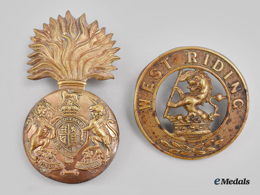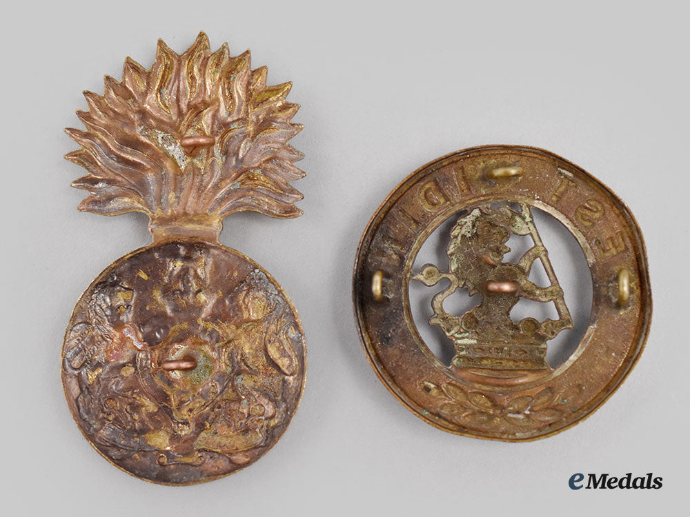 1. Royal Scots Fusiliers Glengarry Badge: in die-stamped bronze gilt, unmarked, measuring 41 mm (w) x 75.8 mm (h), both lugs intact.