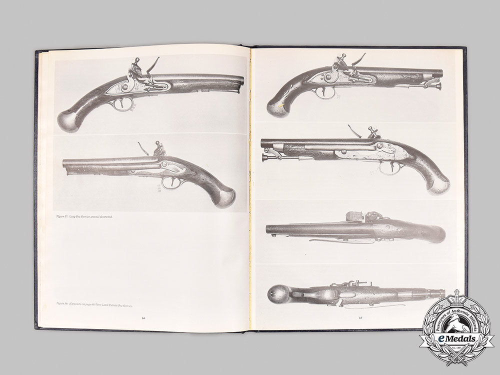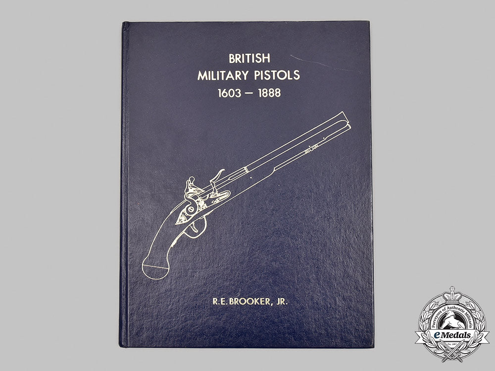 Hardcover, navy blue cloth cover, the text and graphic on the front cover, along with the text on the spine all in silver-coloured ink, entitled "British Military Pistols 1603-1888", by Robert E. Brooker, Jr., copyrighted by the author in 1978, printed by the Taylor Publishing Company of Dallas, Texas in 1978, the printing limited to 1,000 copies, Library of Congress Card Number 77-070785. The book utilizes 1603 as the starting date, since prior to the reign of James I (1603-1625), Brooker was "unable to find any pistols which could plausibly have been used by the English military forces." He goes on to state that "the year 1887 was selected as a stopping point as it is here with the adoption of the Webley Mark I revolver that we are into modern smokeless pistols." It begins with an Acknowledgements, followed by a Table of Contents and a Foreword. The book is divided into nine chapters: I - Pre-Regulation Pistols, 1603-1685; II - Regulation Pattern Military Pistols, 1685-1760; III - Late Flintlock Regulation PIstols, 1760-1837; IV - The Percussion Period; V - Cartridge Revolvers Up to the Smokeless Period; VI - East India Company Pistols; VII - Non-Military Government Pistols; VIII - British Military Pistols Used by Non-British Countries; IX - British Military Patterns Copied by Other Nationalities. It concludes with Appendices: I - A Description of the Littlecote House Pistols; II - Ordnance and Other Marks Found on Pistols Pictured Herein; III - A possible of the Richard Wooldridge 1742 10-inch contract pistol, with two plates of "Late Finds" inserted at the rear. The book contains 140 pages of text and 154 photographic plates, printed in black ink, on a semi-coated white paper stock, measuring 220 mm (w) x 285 mm (h) x 13 mm (d). It is named in black ink to the previous owner on the inside front cover, exhibiting light scuffing on the covers, along with light discolouration on the edges of the pages, the first few and last few pages with scattered fingermarks, some of the pages slightly loose versus the binding and exposing the underlying stitching, however, the pages within remain generally clean, the photographs crisp. A very hard to find book and high in demand among collectors. Better than very fine.