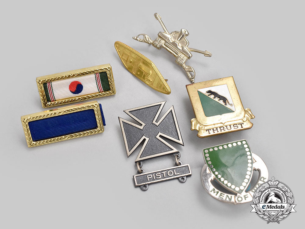 24. 89th Tank Battalion "Thrust" Insignia Lapel Badge: in bronze gilt with green, white and black enamels, maker marked "N.S. MEYER, INC. NEW YORK" with the company's insignia on the reverse, measuring 30.3 mm (w) x 29.5 mm (h).