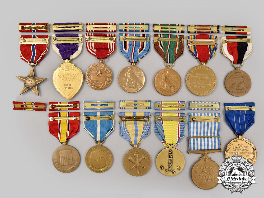 1. Bronze Star Medal with two Oak Leaf Clusters and "V" Device, plus Ribbon Bar: engraved "MORTON SEMELMAKER" on the reverse.