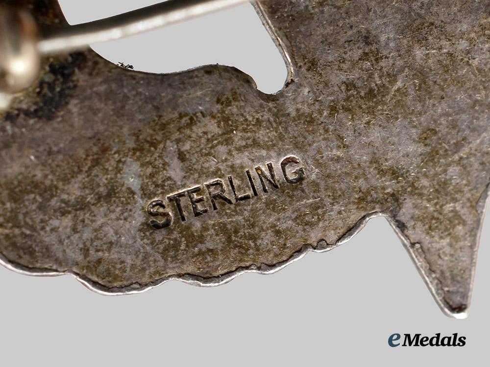 A Parachutist Jump Badge, in silver, reverse marked STERLING, horizontal pin, measures 37.8 mm (w) x 22.7 mm (h), light wear, in very fine condition.