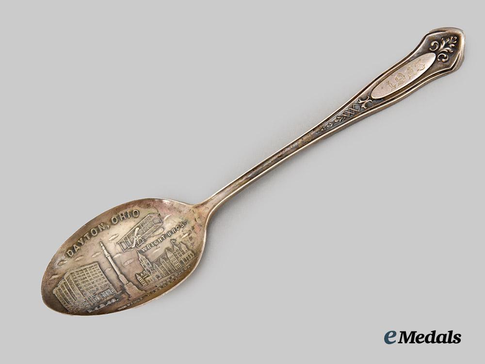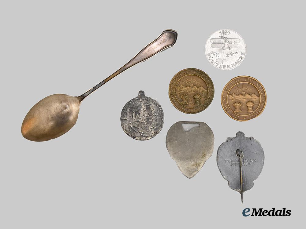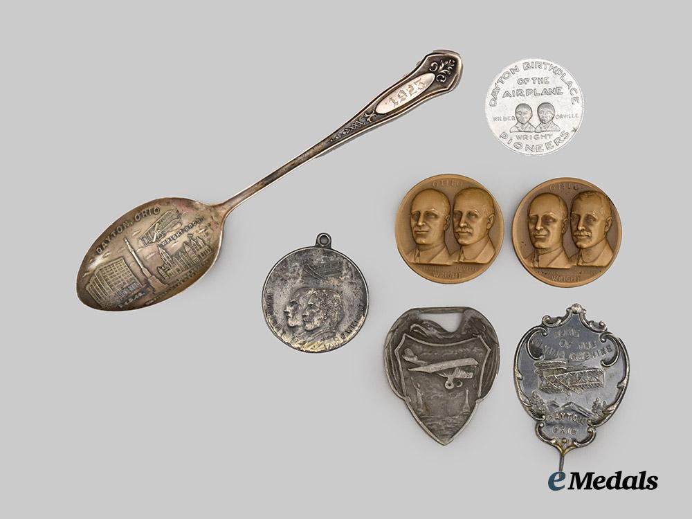 A lot of medals, pins, and a commemorative spoon, consisting of 1) A Wright Brothers Home Celebration medal possibly worn by either Orville or Wilburn Wright, 2) Two “Great Seal of the State of Ohio” table medals, 3) A “Home of the Flying Machine” pin, along with an aluminum medal and metal fob.