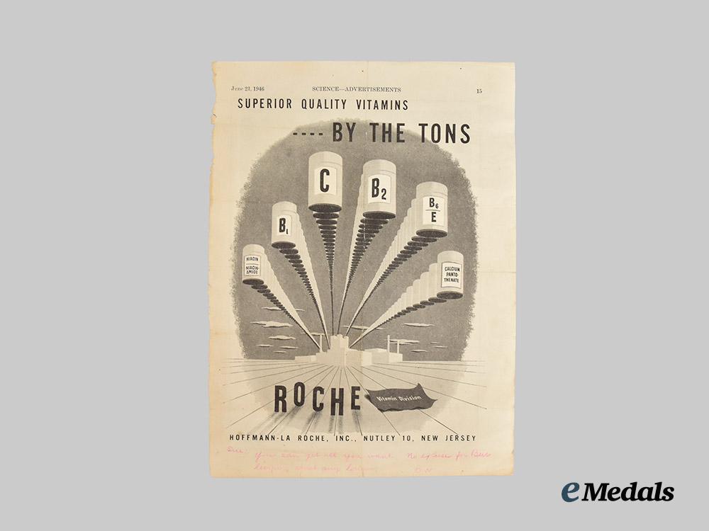 A page taken from a newspaper, dated June 21st, 1946 depicting an advertisement for “Superior Quality Vitamins….by the tons” - depicting barrels of labeled vitamins leaving a factory complex, labeled “Roche Vitamin Division” of the Hoffman LA Roche Inc. Nutley 10, New Jersey, with a hand written note underneath reading “Sue: You can get all you want. No excuse for Bus limping around any longer” - signed O.W. (Orville Wright), measuring 290 mm (w) x 259 mm (l).