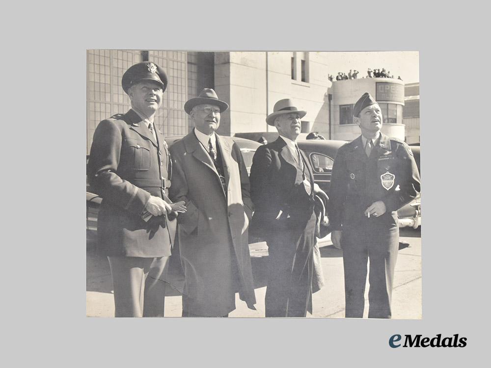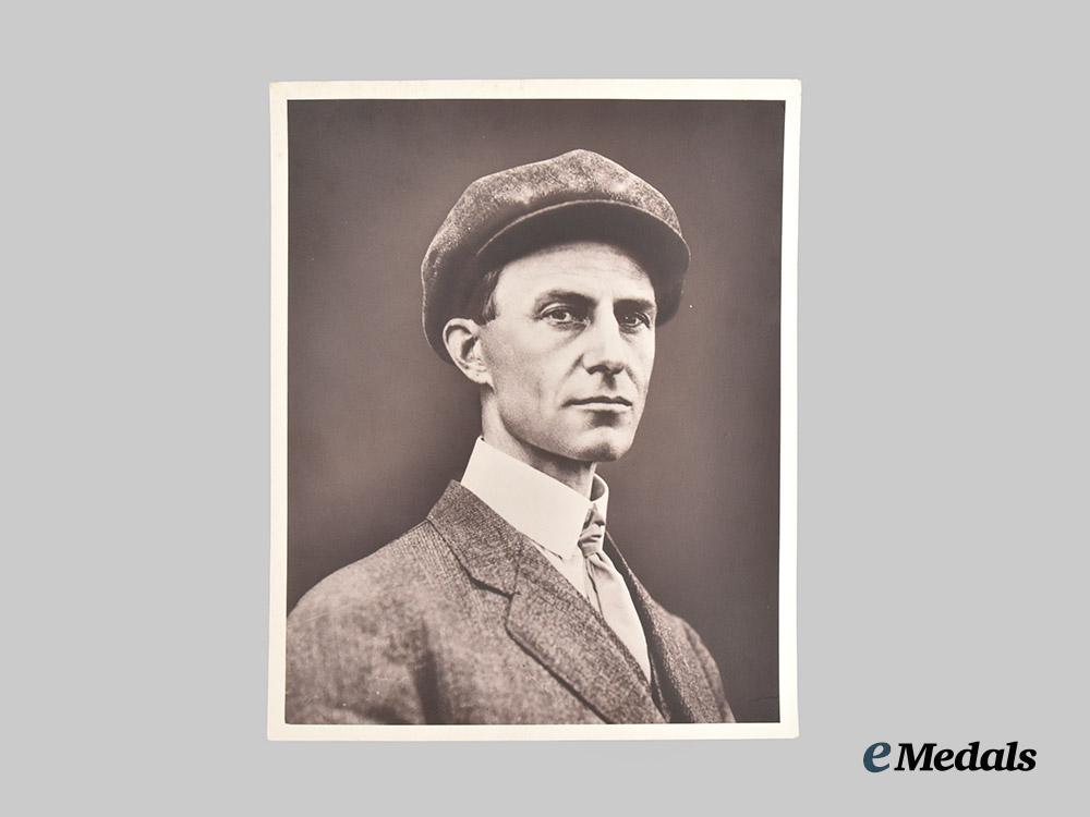 A large reprint of a black-and-white photograph depicting Orville Wright of the Wright Brothers, along with Colonel Edward Deeds. It is labeled on the reverse “Orville Wright & Col. Edward Deeds from the Estate of Horace A. Wright”, measuring 352 mm (w) x 278 mm (l).
