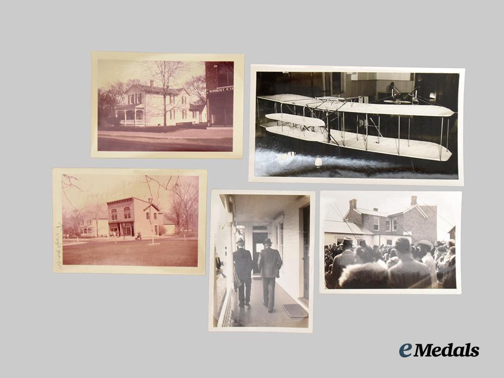 A collection of seven black-and-white photographs, of the Wright Brothers, their home and bicycle shop at the dedication by the Henry Ford Museum. With two newspaper segments regarding the life and legacy of the Wright Brothers, along with the death announcement of the Wright Brothers’ nephew, Horace “Bus/Buster” Wright, who died at age 86.