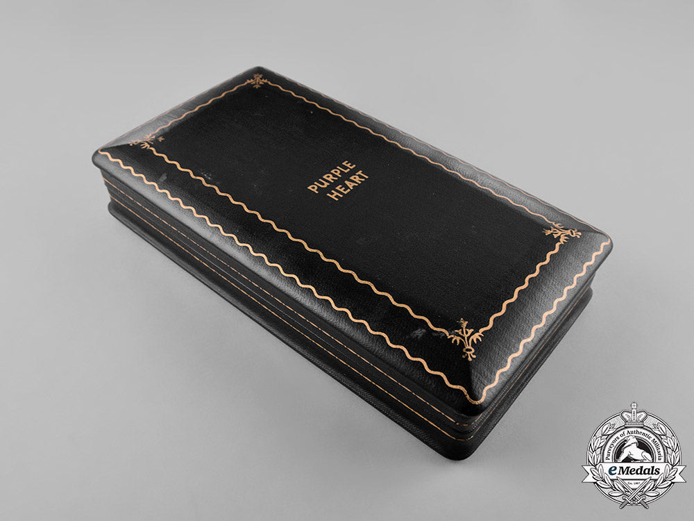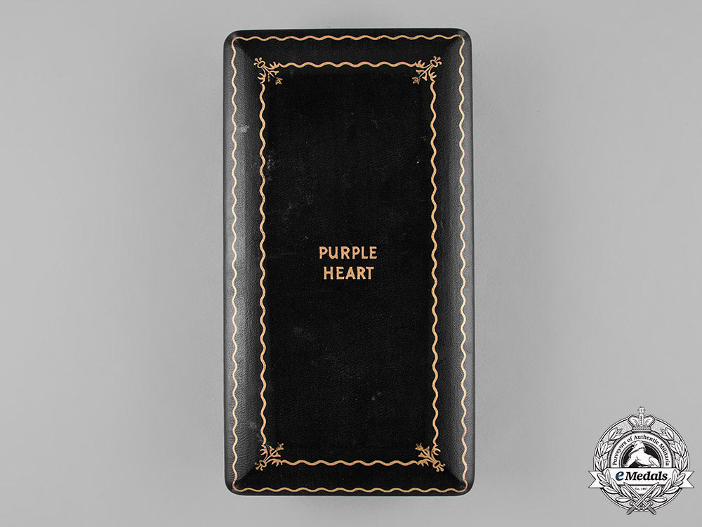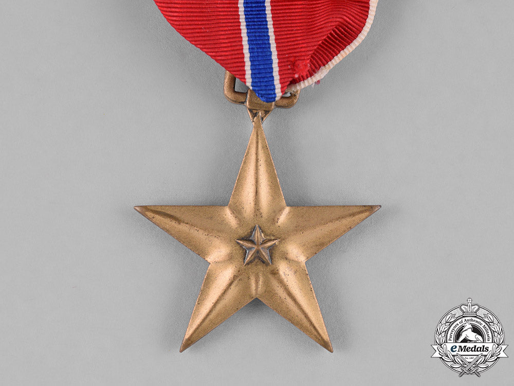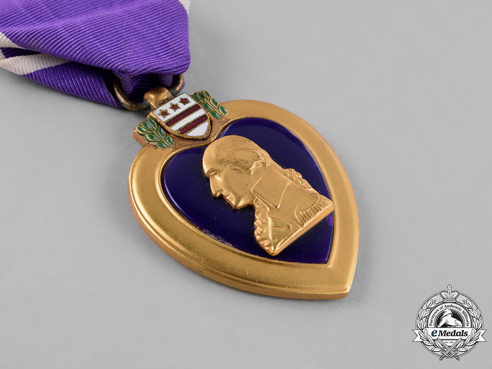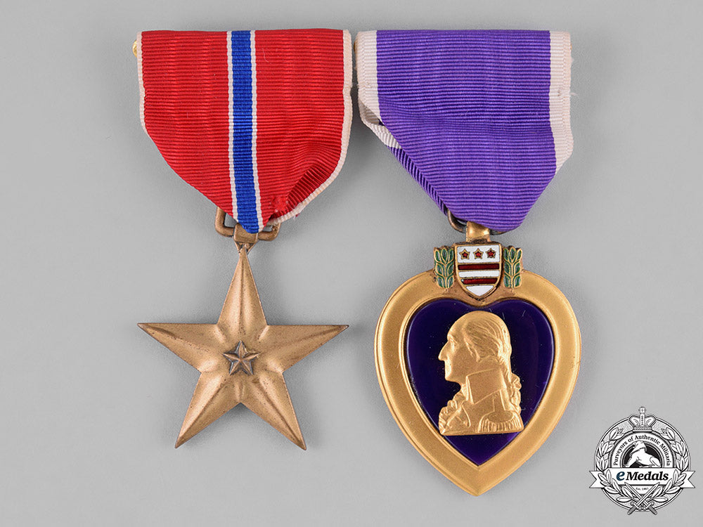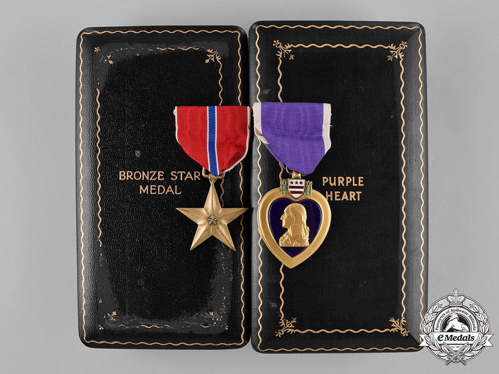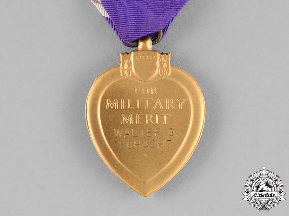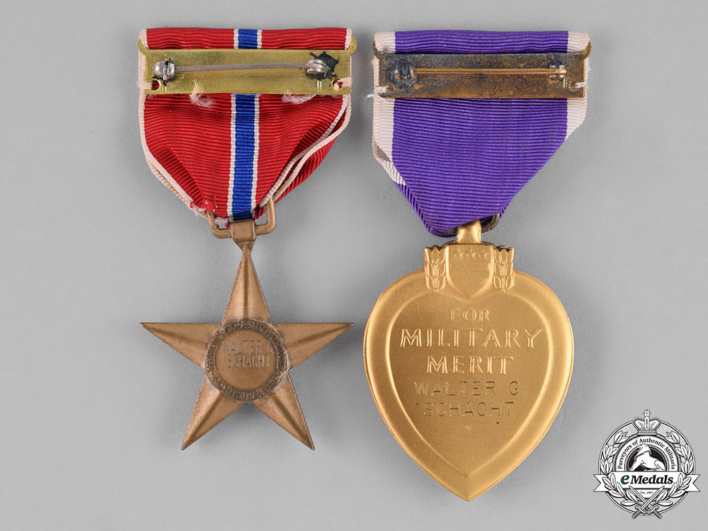 Bronze Star Medal (in bronze, engraved "WALTER G. SCHACHT" on the reverse, measuring 35.8 mm (w) x 35.5 mm (h), original ribbon with brooch pinback, spotting, in its hardshelled case of issue, marked "BRONZE STAR MEDAL" on the lid, scuffing evident on the exterior); and Purple Heart (two-piece construction, in bronze gilt with purple, red, white and green enamels, engraved "WALTER G. SCHACHT" on the reverse, measuring 35 mm (w) x 43 mm (h), original ribbon with brooch pinback, intact enamels, accompanied by a 17.3 mm (w) x 4 mm (h) enameled ribbon bar and a silvered 9.5 mm (w) x 25.3 mm (h) First Lieutenant's rank collar insignia, in its hardshelled case of issue, marked "PURPLE HEART" on the lid, missing its securing tab on the medal bed). Accompanied by copies of his file cards and an enlistment record. Near extremely fine.