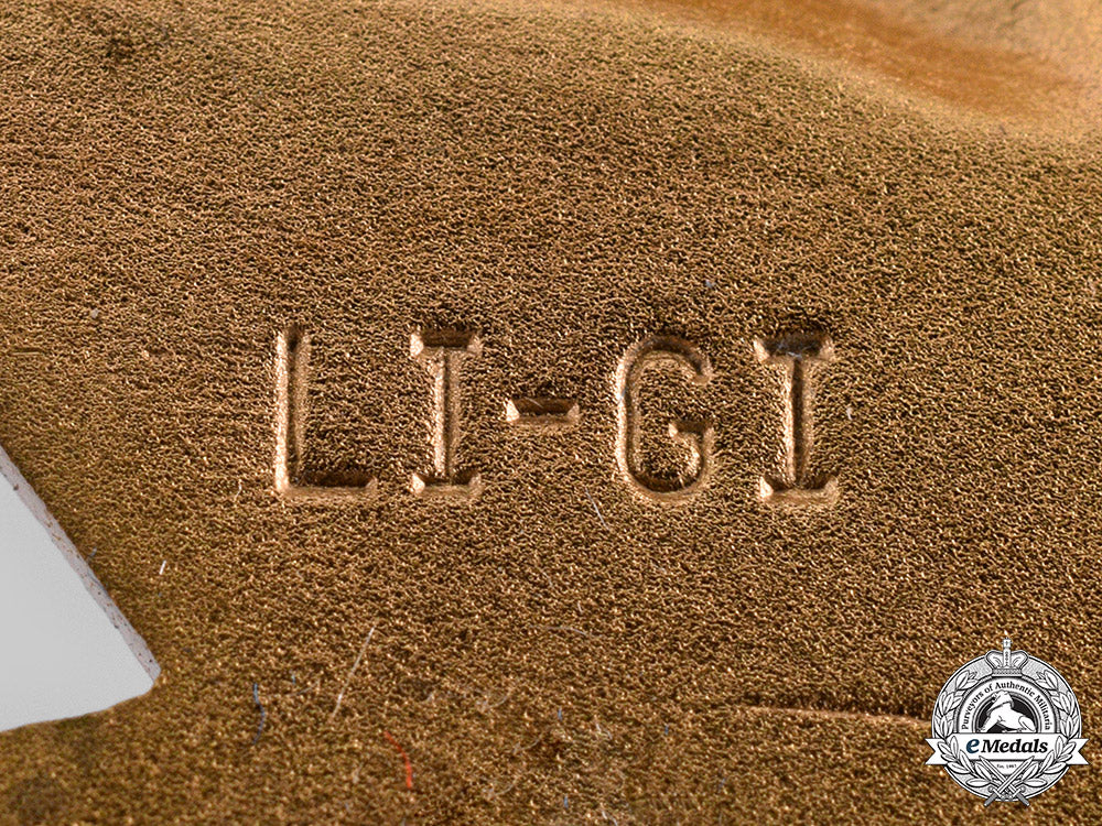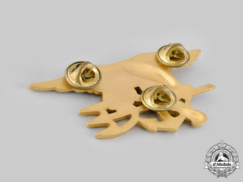 In bronze gilt, marked "LI-GI" (Lordship Industries, Government Inspected) on the reverse, illustrating an eagle clutching a U.S. Navy anchor, trident and flintlock style pistol in its talons, measuring 70.5 mm (w) x 36 mm (h), triple push pins, scattered gilt wear, near extremely fine.